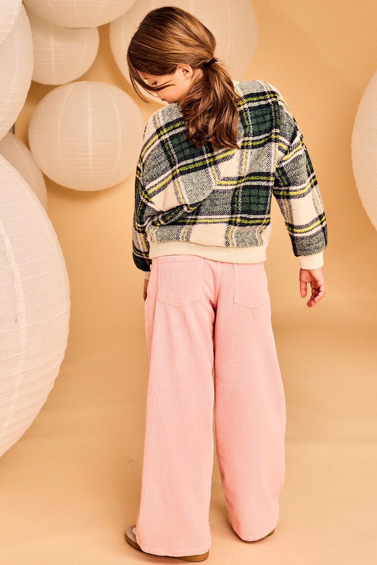 Högmidjade byxor i bred manchester designad med vida ben. Byxan har en klassisk 5-ficksdesign, justerbar resår i midjan.