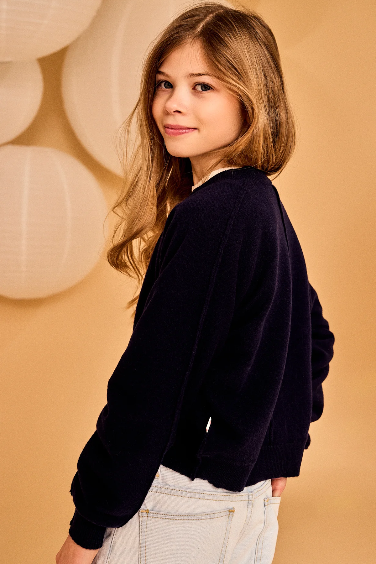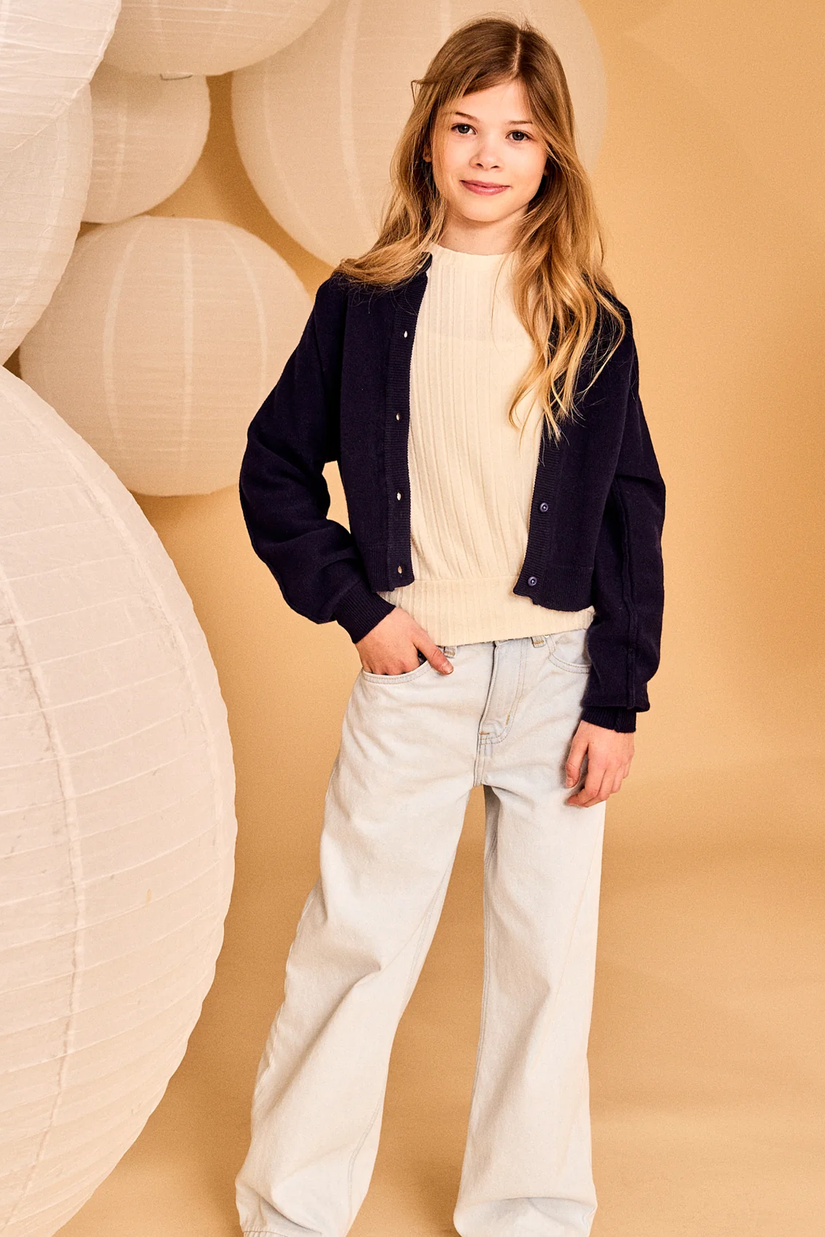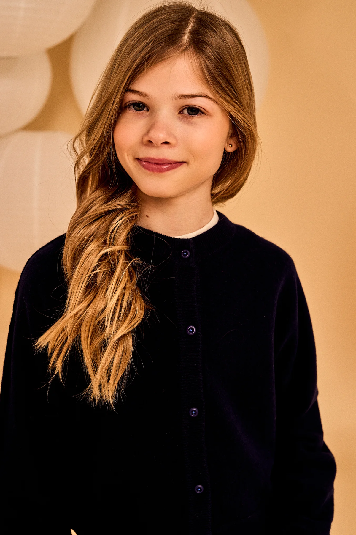 Finstickad cardigan i 100% ull, desginad i en kort passform, knappar fram och klassisk rundhals.
