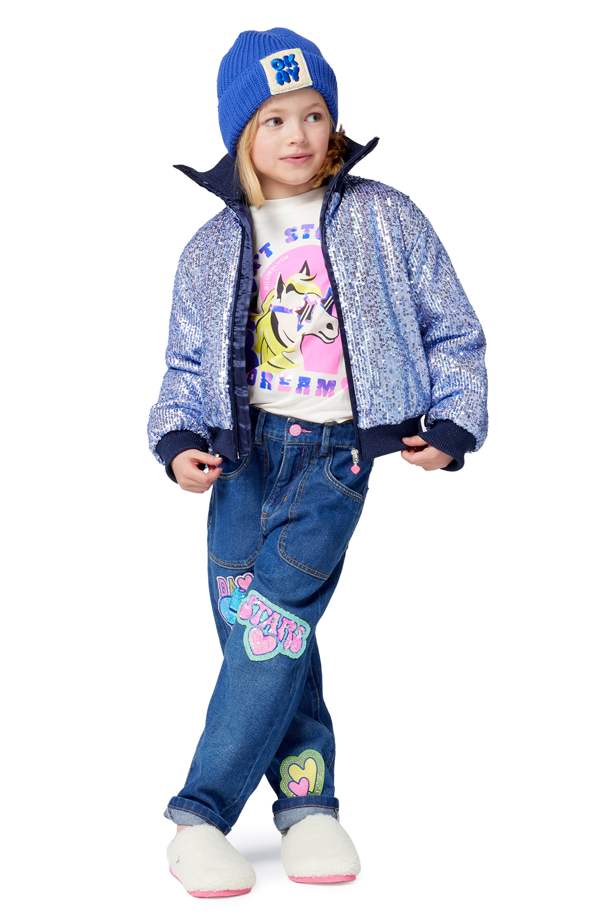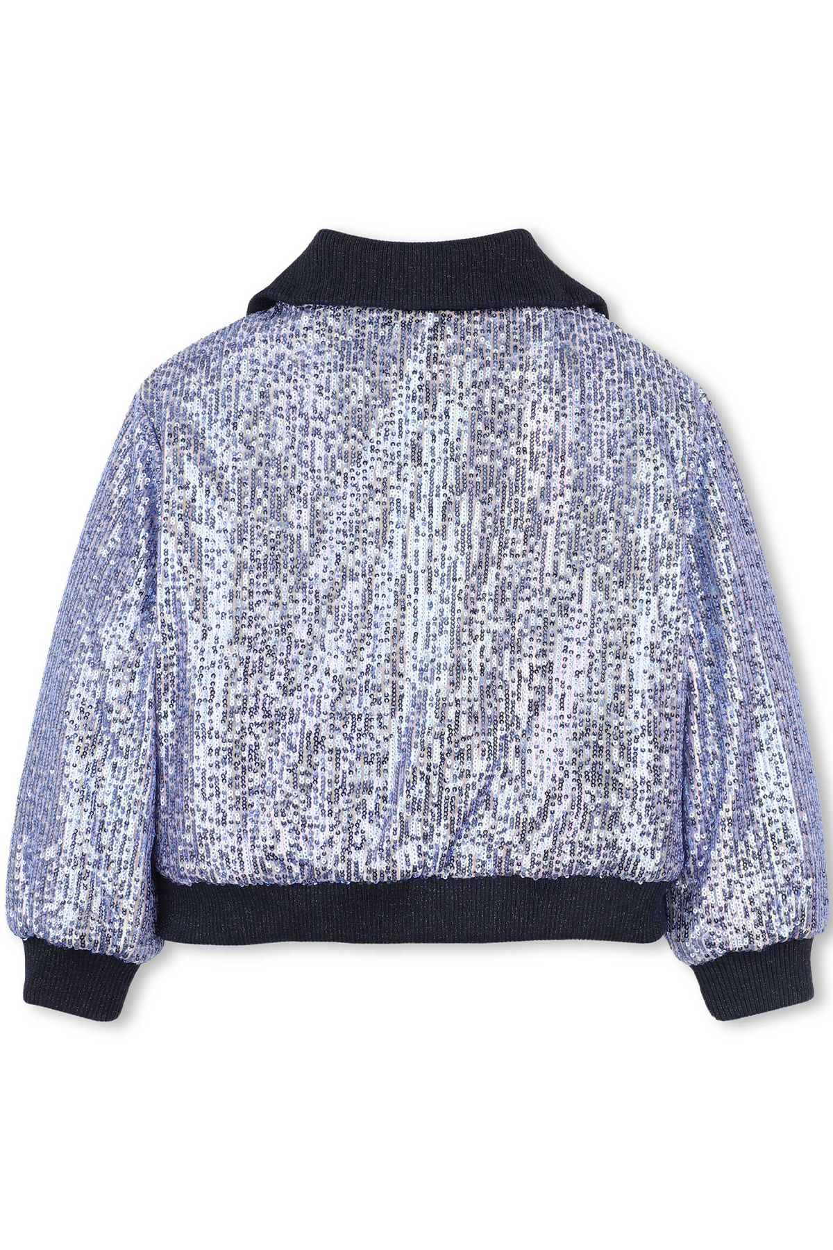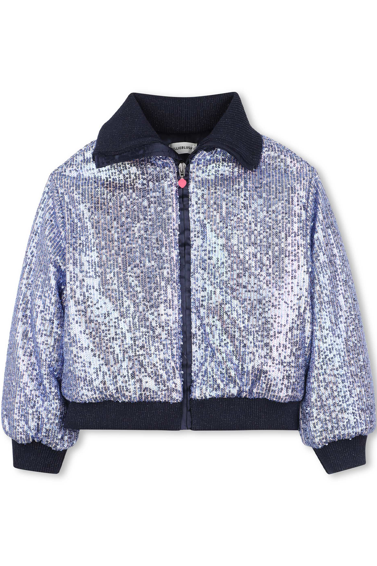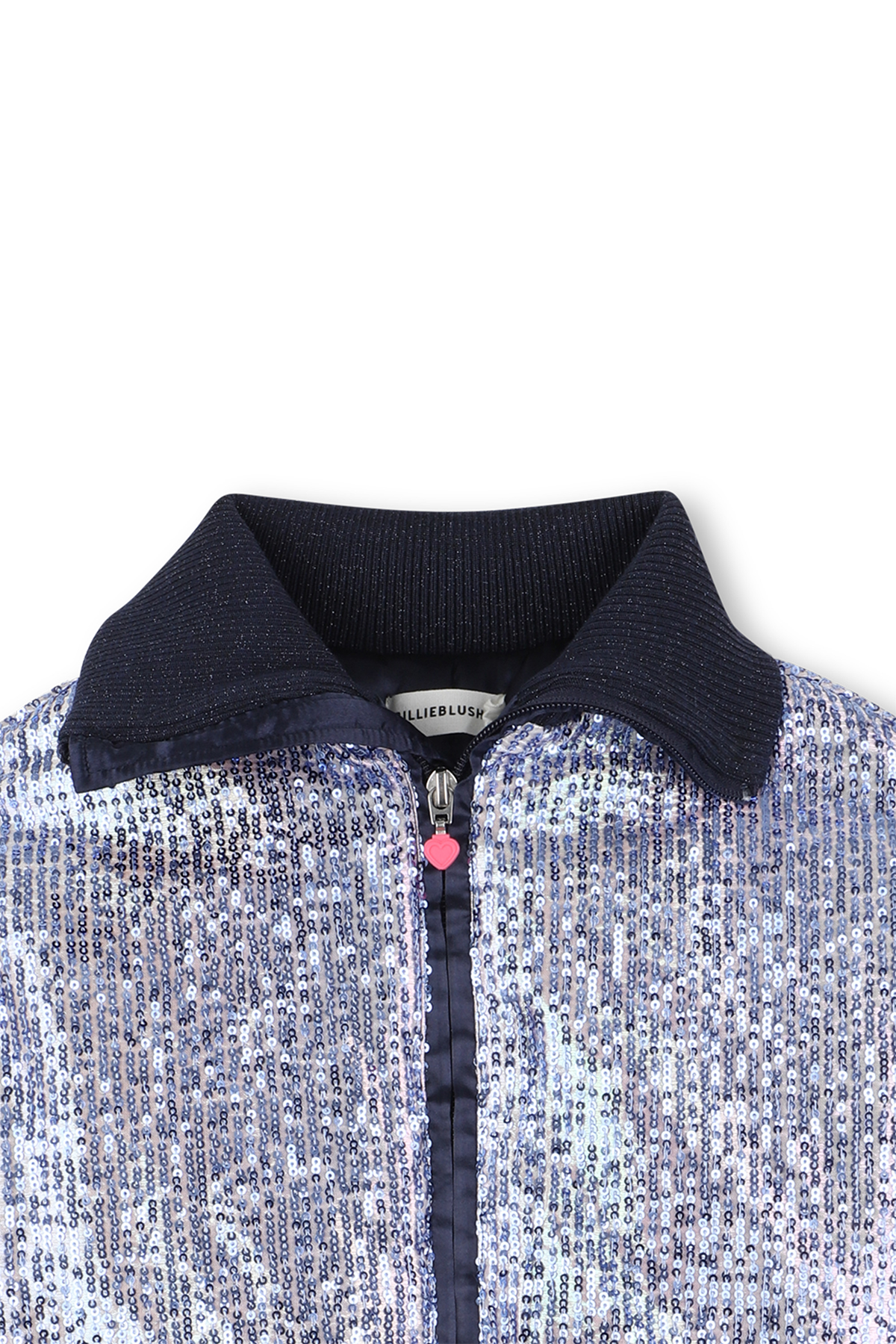 Bomberjacka klädd i glittrande lila paljetter, jackan har en hög nedvikbar krage och breda muddar i marinblå glitterlurex.