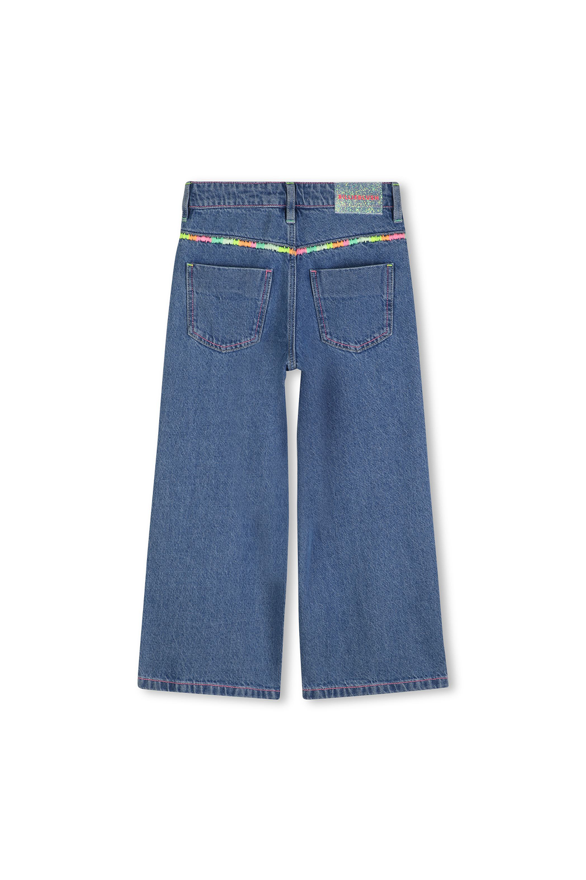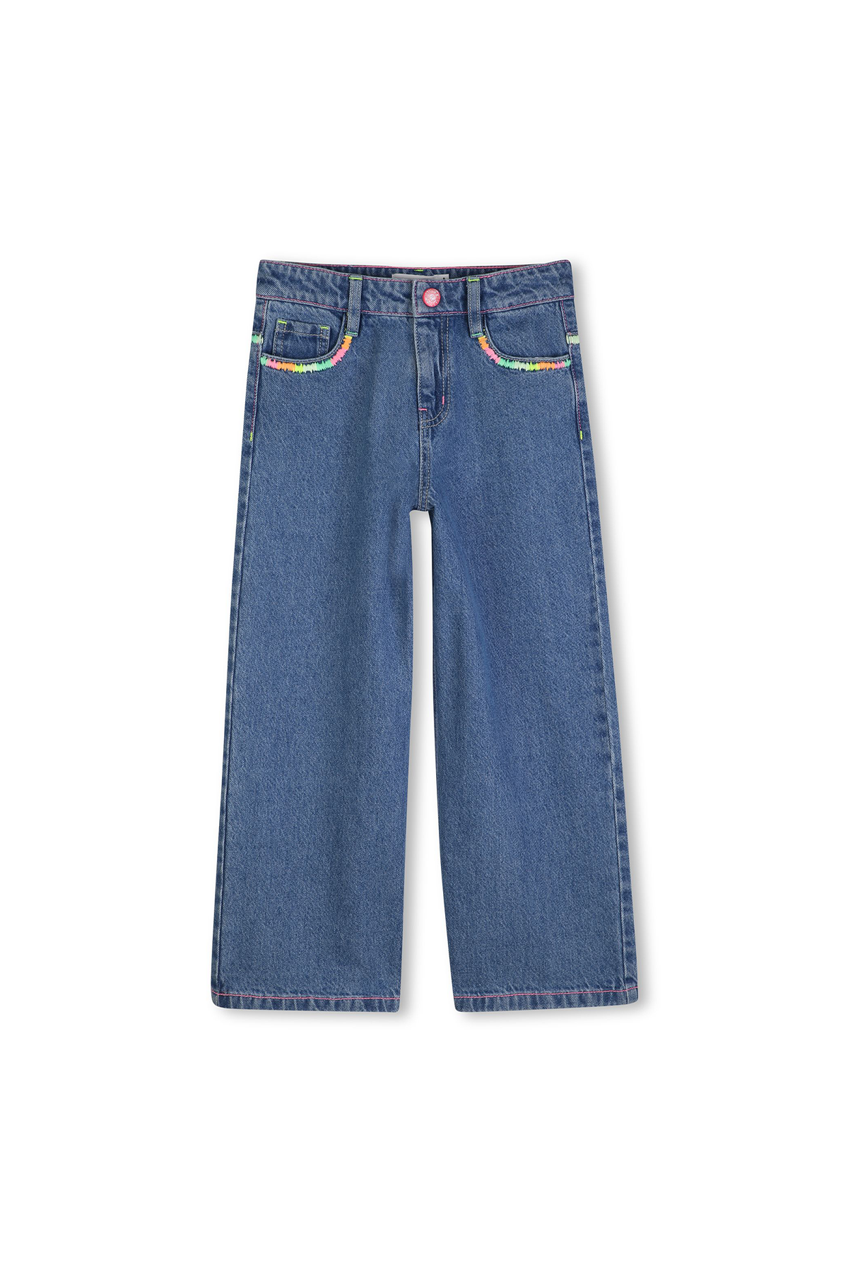 Raka jeans i en lätt baggy passform, jeansen har en medelhög midja och justerbar resår. Dekorerad med en flerfärgad brodering runt fickor.