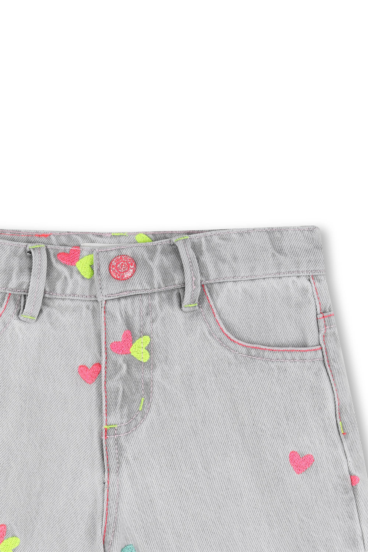 Ljusgrå jeanshorts med broderade hjärtan i neon över hela! Dessa shorts har en medelhög midja, klassisk 5-ficksdesign och en justerbar resår i midjan.