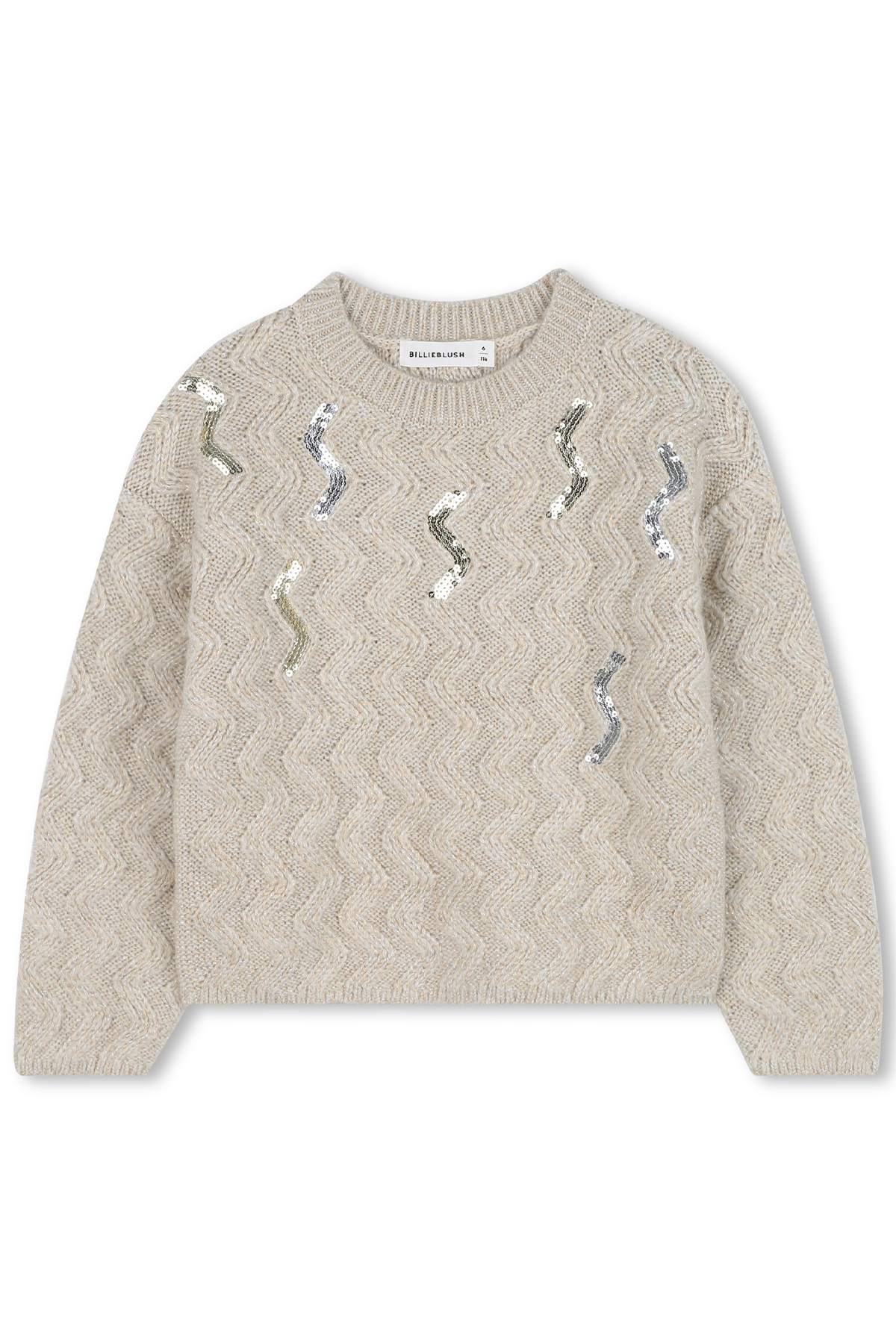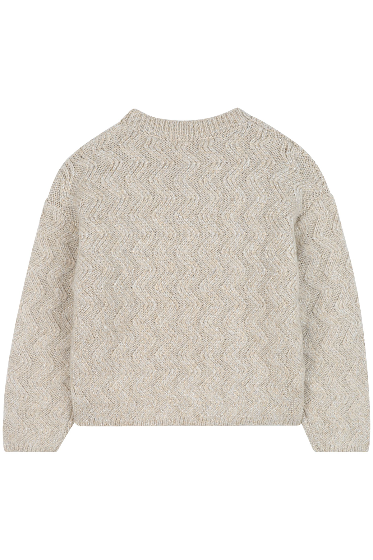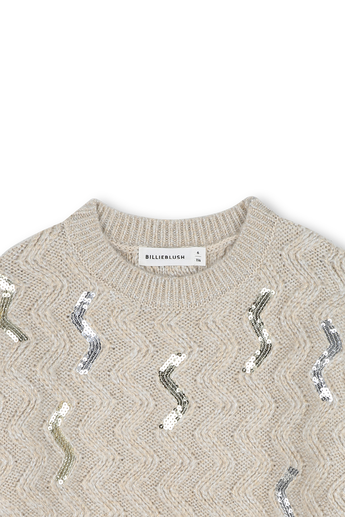 Stickad tröja i ett zig-zag mönster och paljetter på framsidan. Tröjan har en beige botten med guldiga och silvriga lurextrådar över hela. Rak passform.