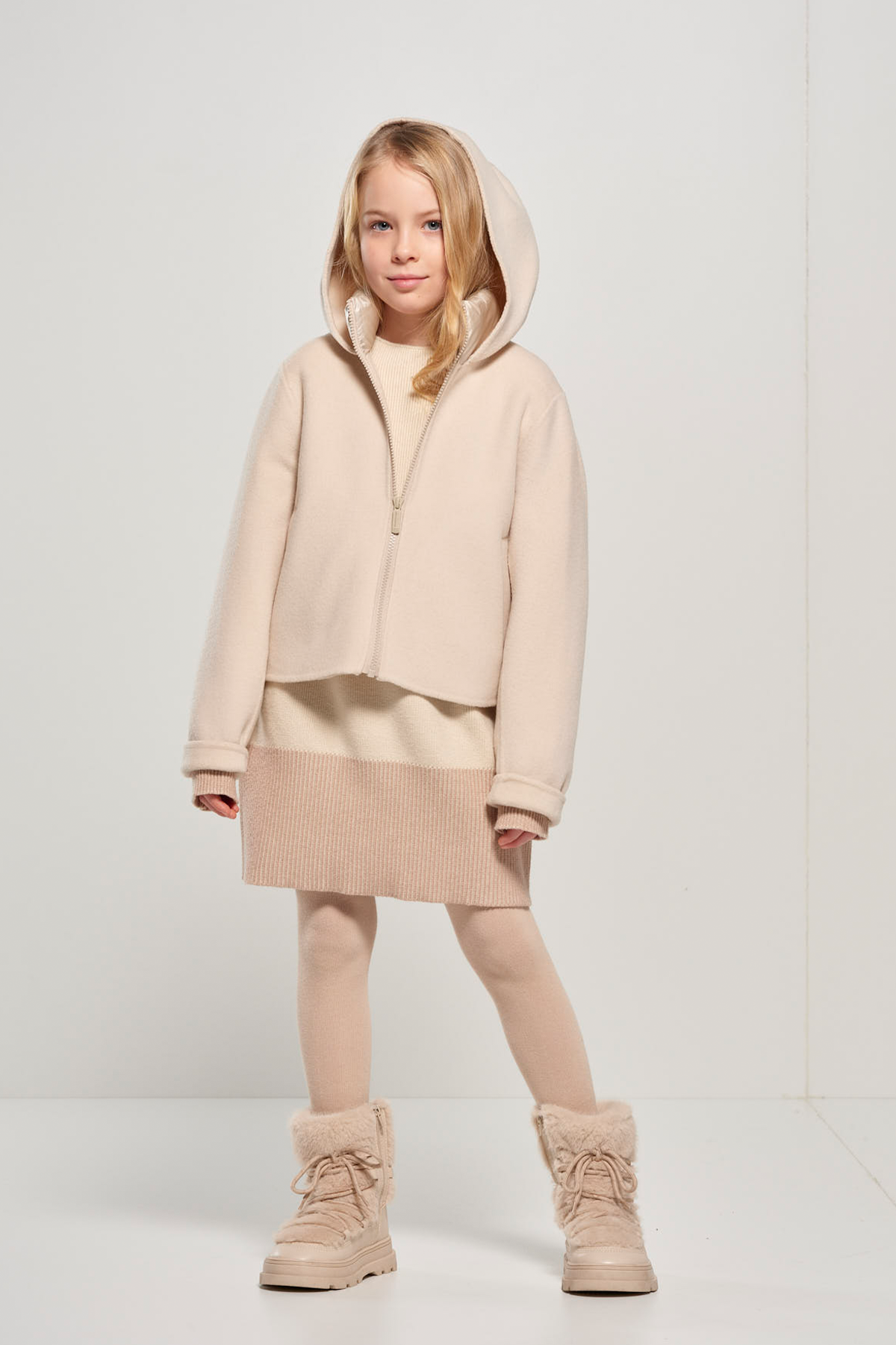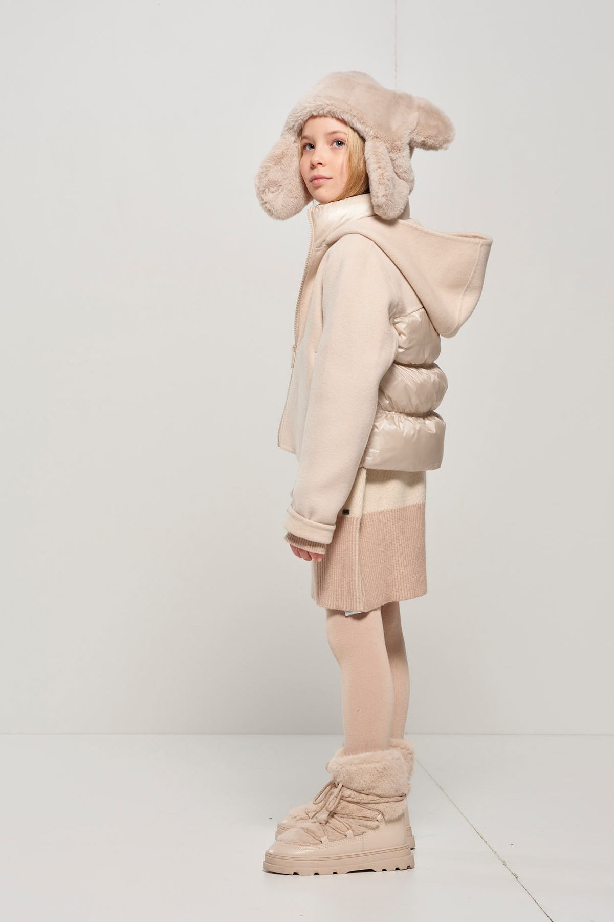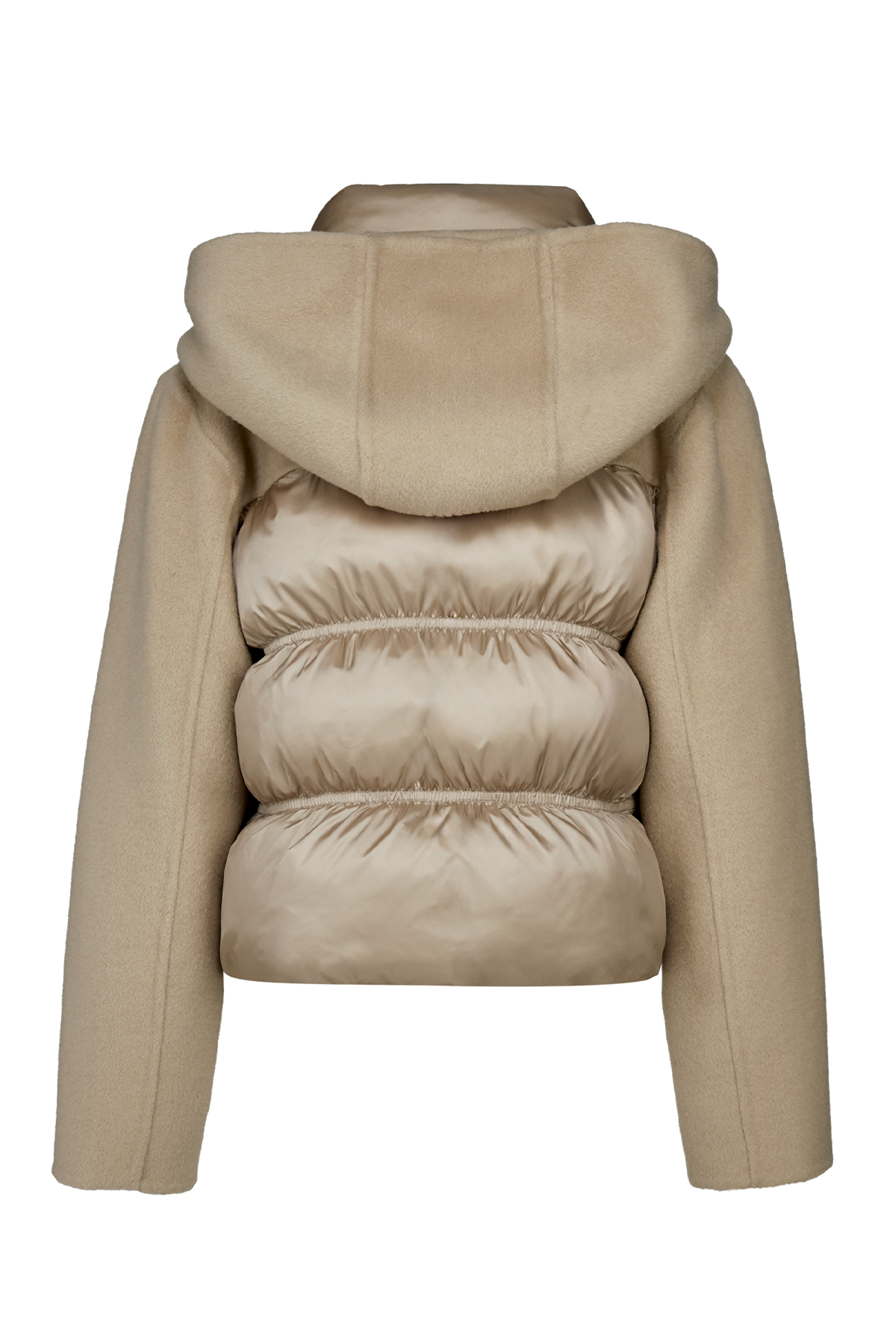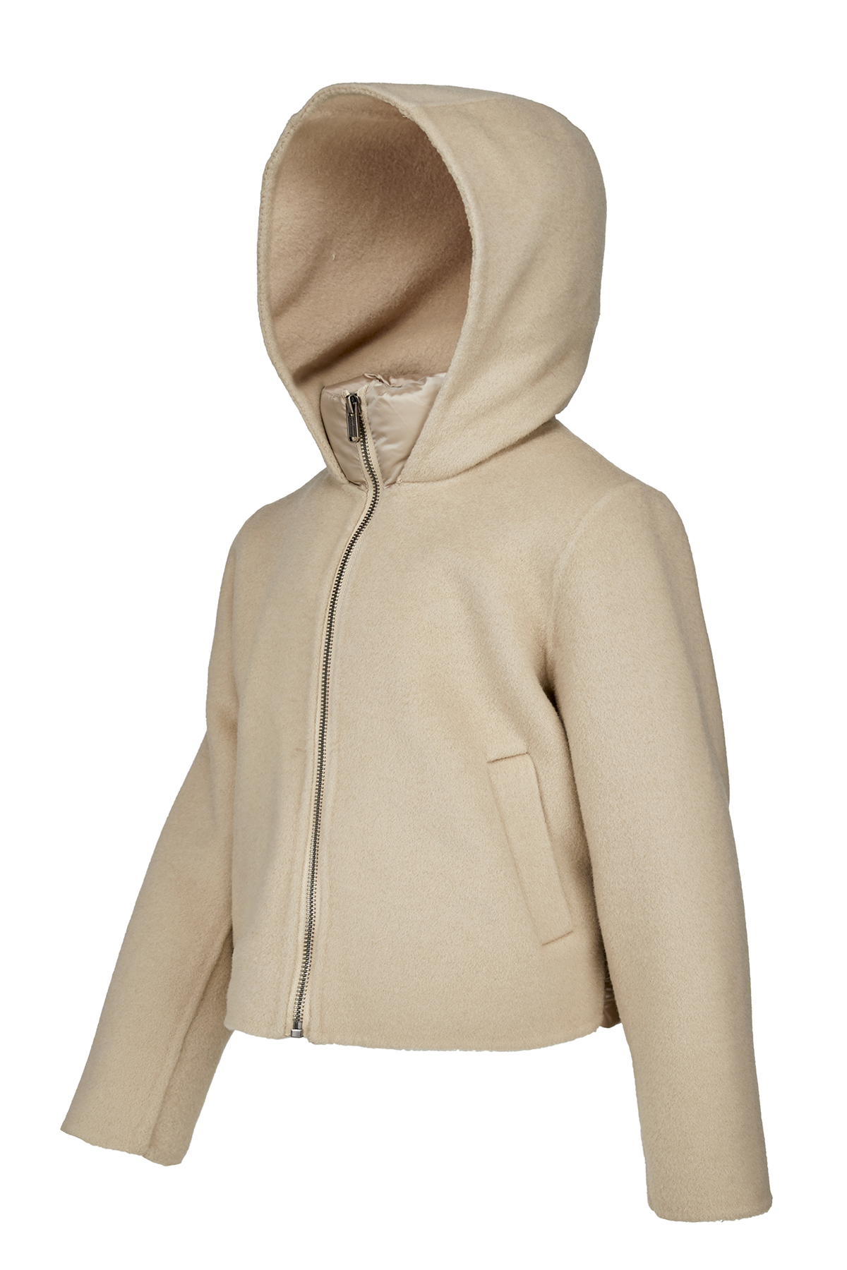 Kort hybridjacka designad i värmande ull med en vadderad rygg. Denna lättviktsjacka har en unik design, den släta framsidan ger en elegant och polerad look medan den quiltade baksidan i nylon skapar en cool kontrast. Jackan har en rymlig och värmande huva, en hög vadderad krage och två framfickor. Ett perfekt val att bära i mellansäsongerna!