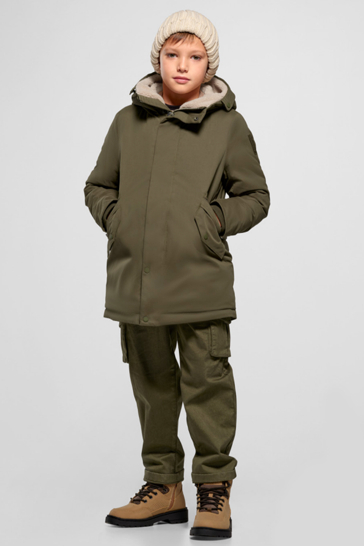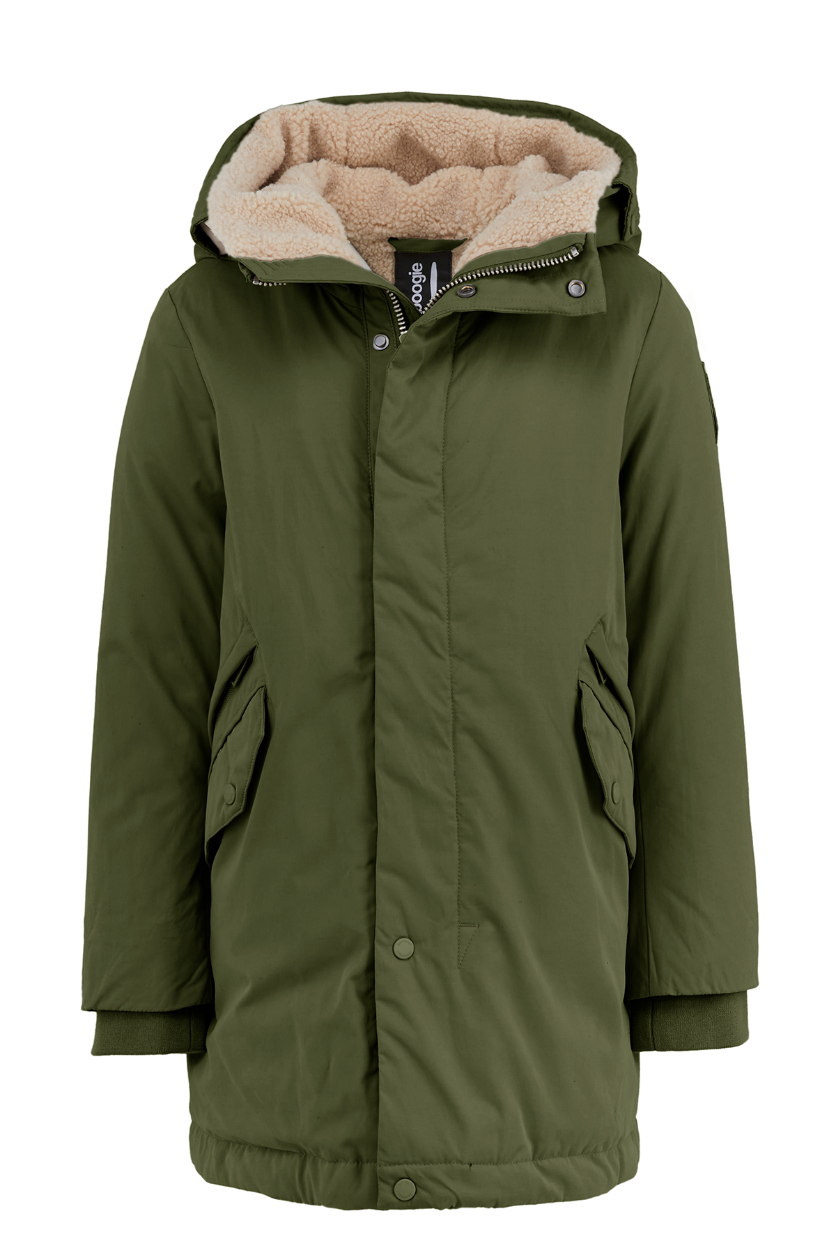 Teddyfodrad parkas designad i en tuff kakigrön nyans. En lång jacka som erbjuder värme och skydd under säsongens kyliga dagar, skönt fodrad med pile och primaloft. Jackans lättviktsfyllning isolerar från kylan utan att ge ett tungt och klumpigt plagg, vilket gör jackan perfekt för skolan och dagar utomhus! Försedd med fyra framfickor, en innerficka, invändigt justerbar dragsko i midjan samt tvåvägsdragkedja för ökad flexibilitet.