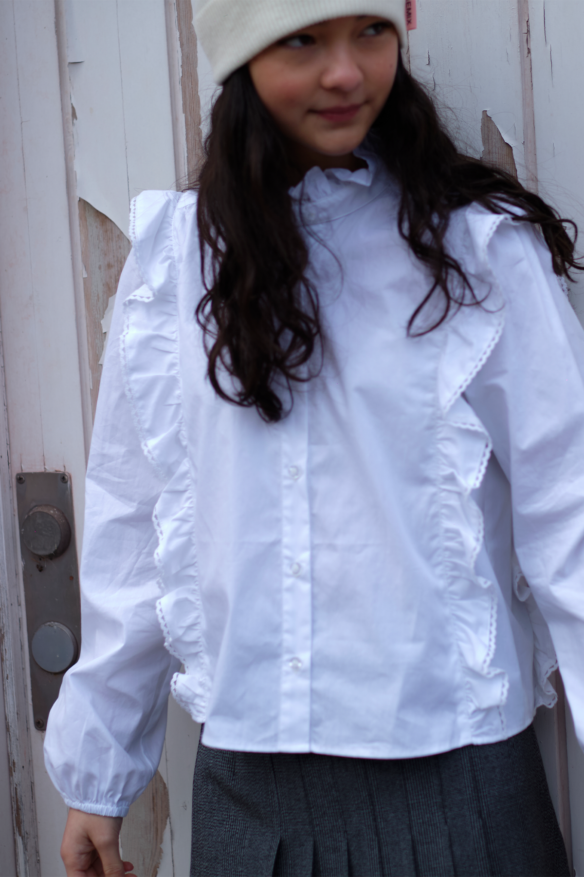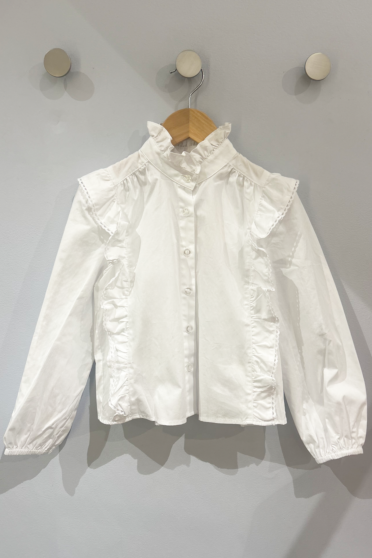 Blus Claire har en iögonfallande design med spetsprydda volangdetaljer och upphöjd krage, en chich match till säsongens jeans och kjolar!