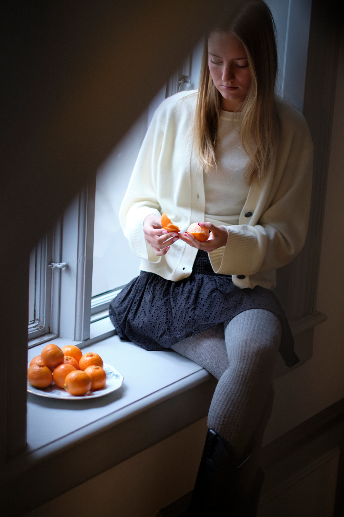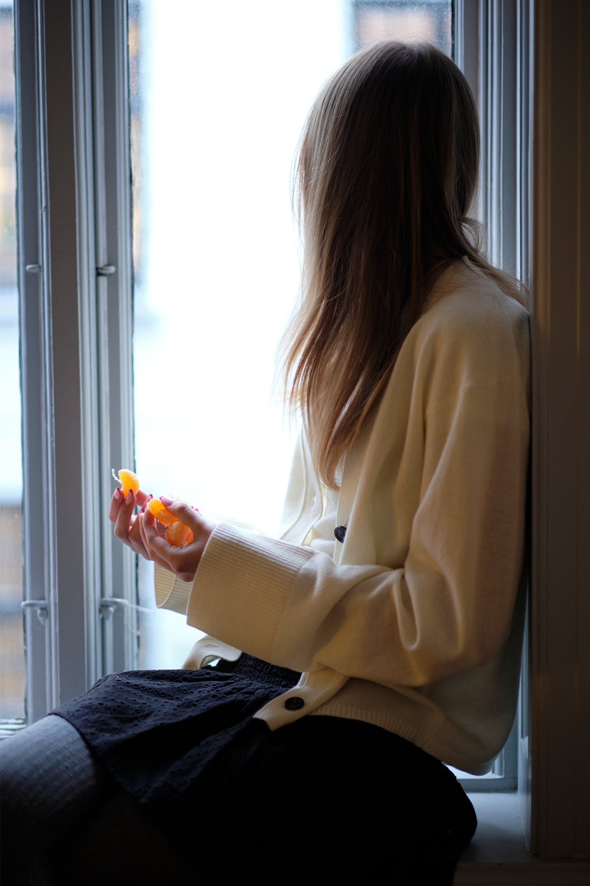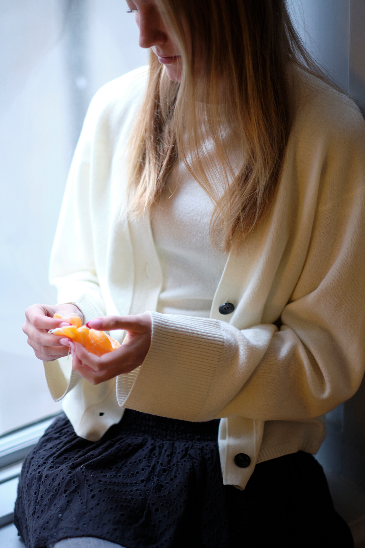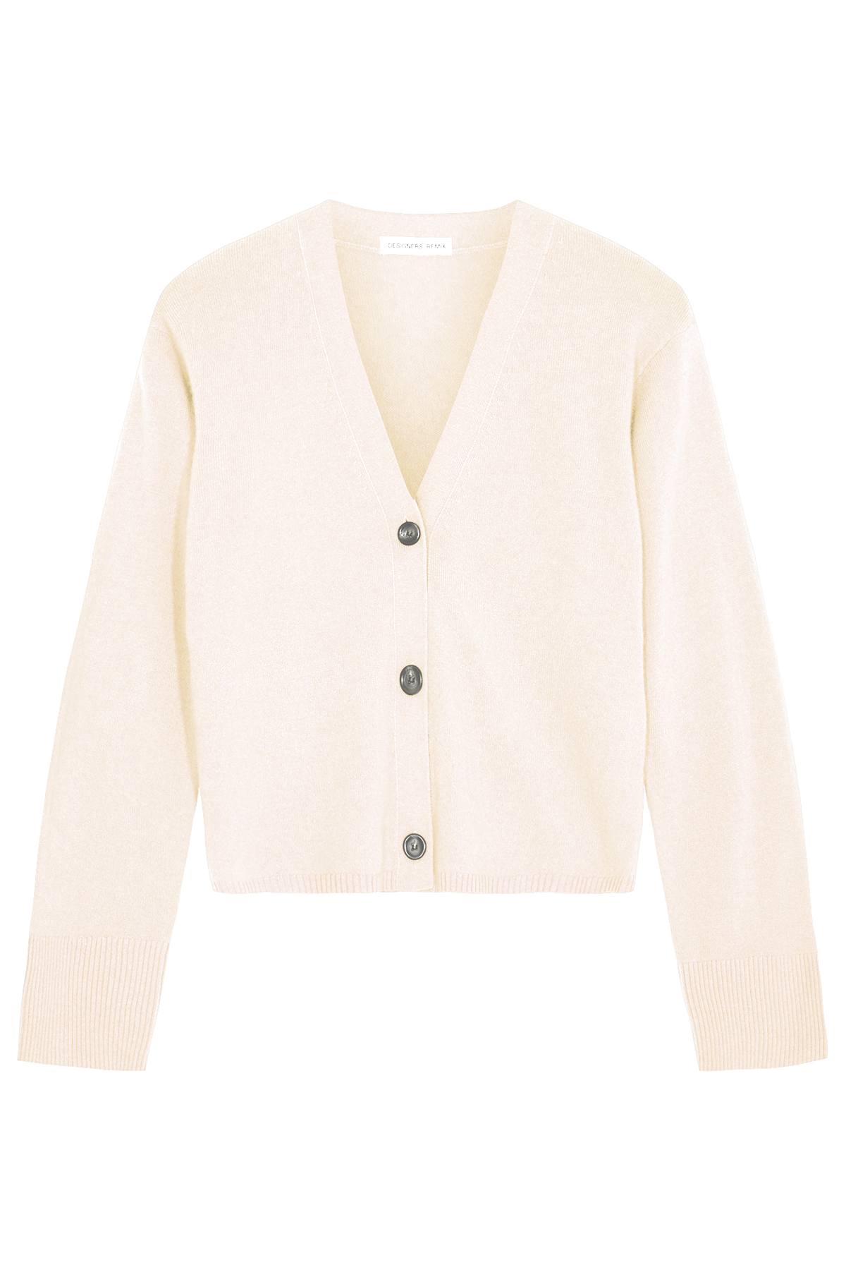 Finstickad kofta i ull- och kashmirblandning med v-ringning, knäppning fram och ribbade kanter.