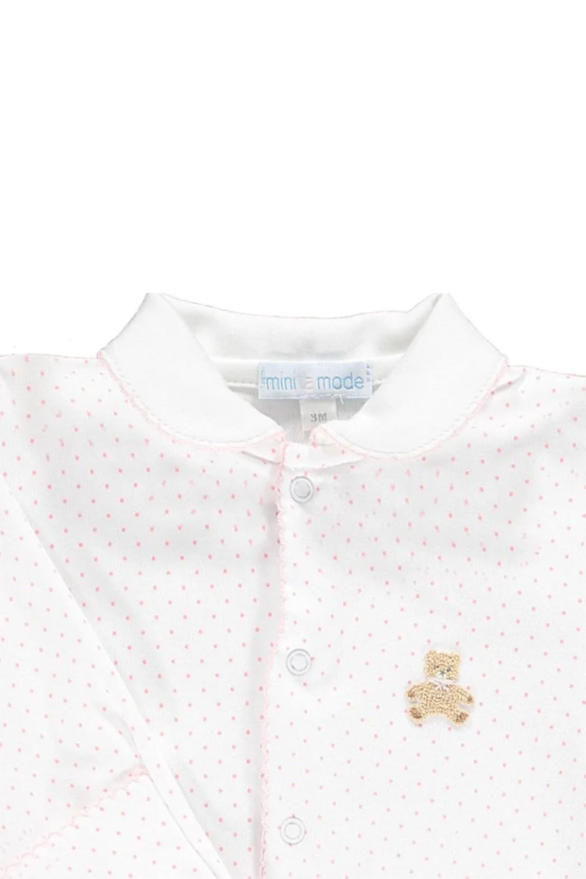 Bedårande prickig pyjamas dekorerad med en söt liten nallebjörn på bröstet matchat med en rundad krage. Tillverkad i 100% pima bomull, vilket gjort sig känt för att ha dubbel så läng livslängd som konventionell bomull samt är extra mjuk, det perfekta valet för känslig bebishy! Pyjamasen är försedd med tryckknappar längs mage och mellan grenen för ett enkelt ombyte. Påsydd fot och ärmslut som enkelt går att vika över för en heltäckande och värmande passform upp till strl. 9 månader.