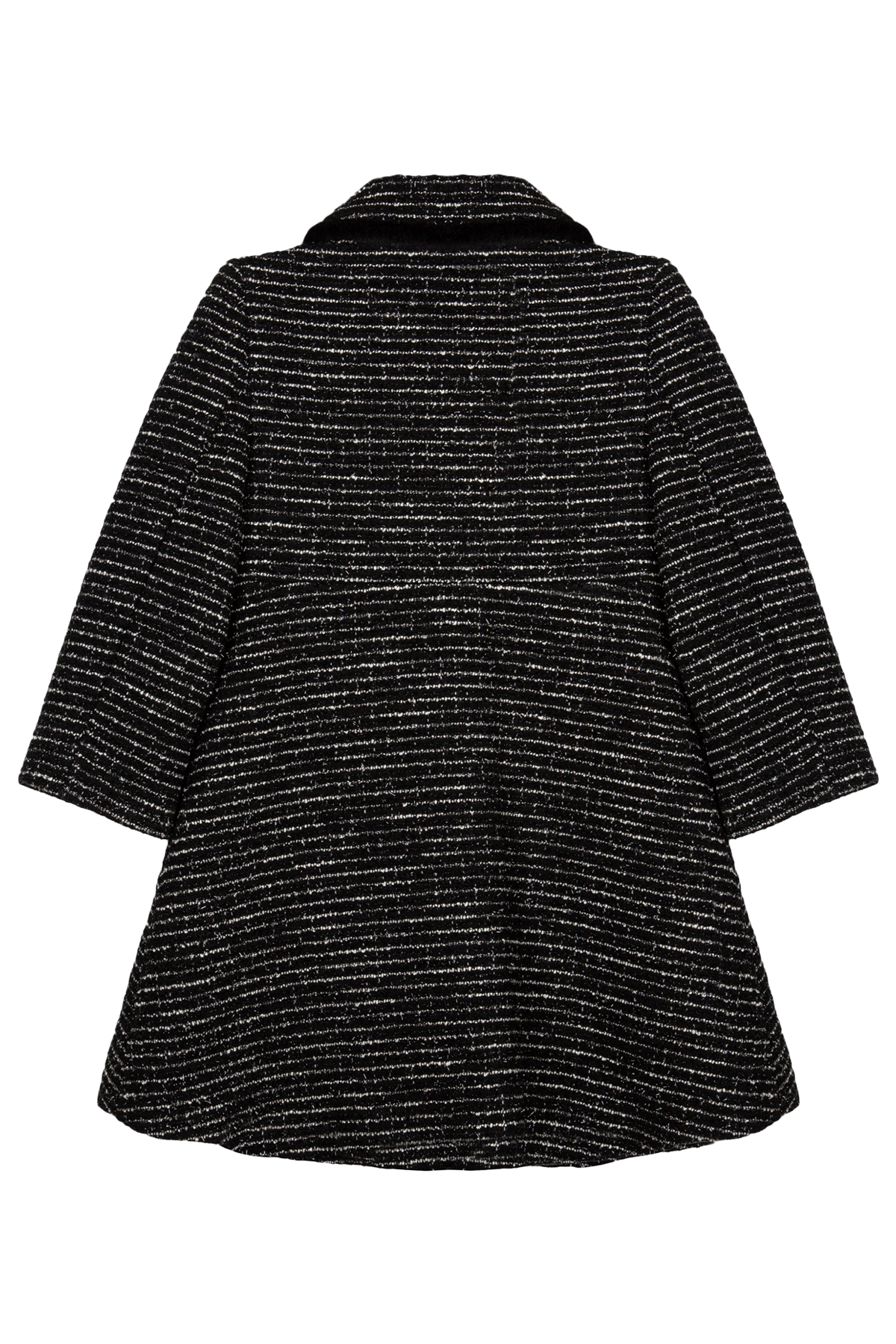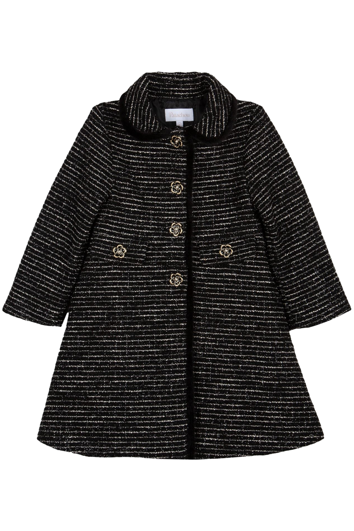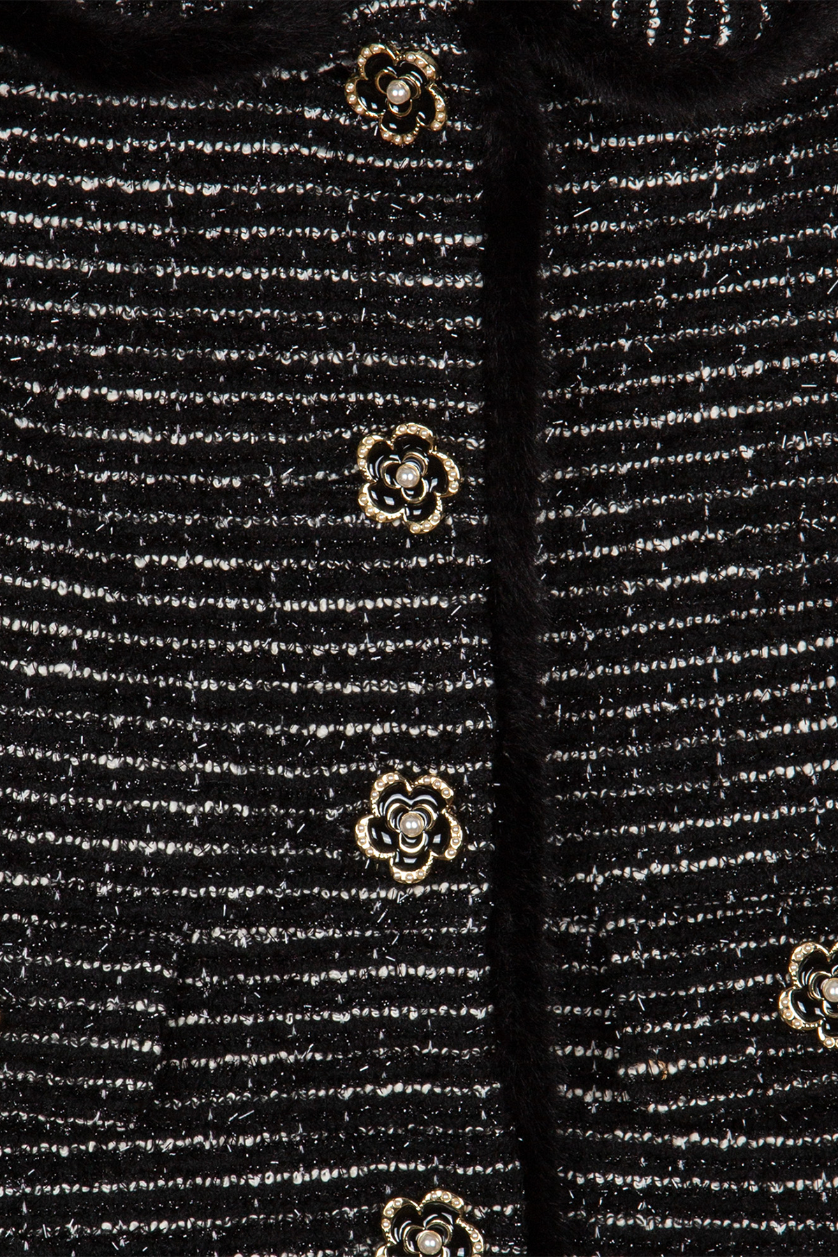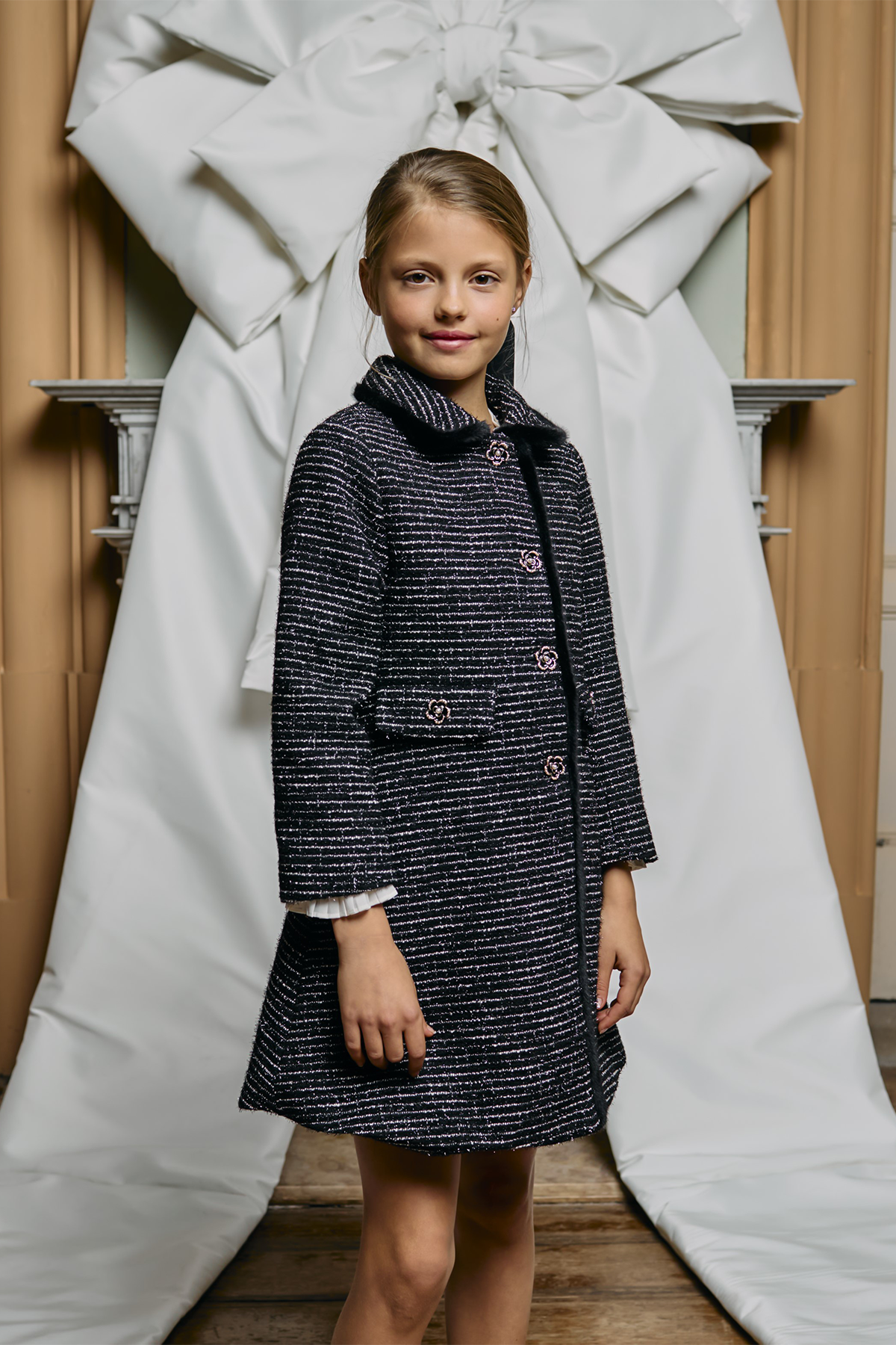 Elegant kappa i tweed designad i en a-linjeform, den har subtila lurexdetaljer, har en kontrasterande krage med velvetdetaljer, trekvartsärm och dekorativa blom-forfmade knappar i guld.