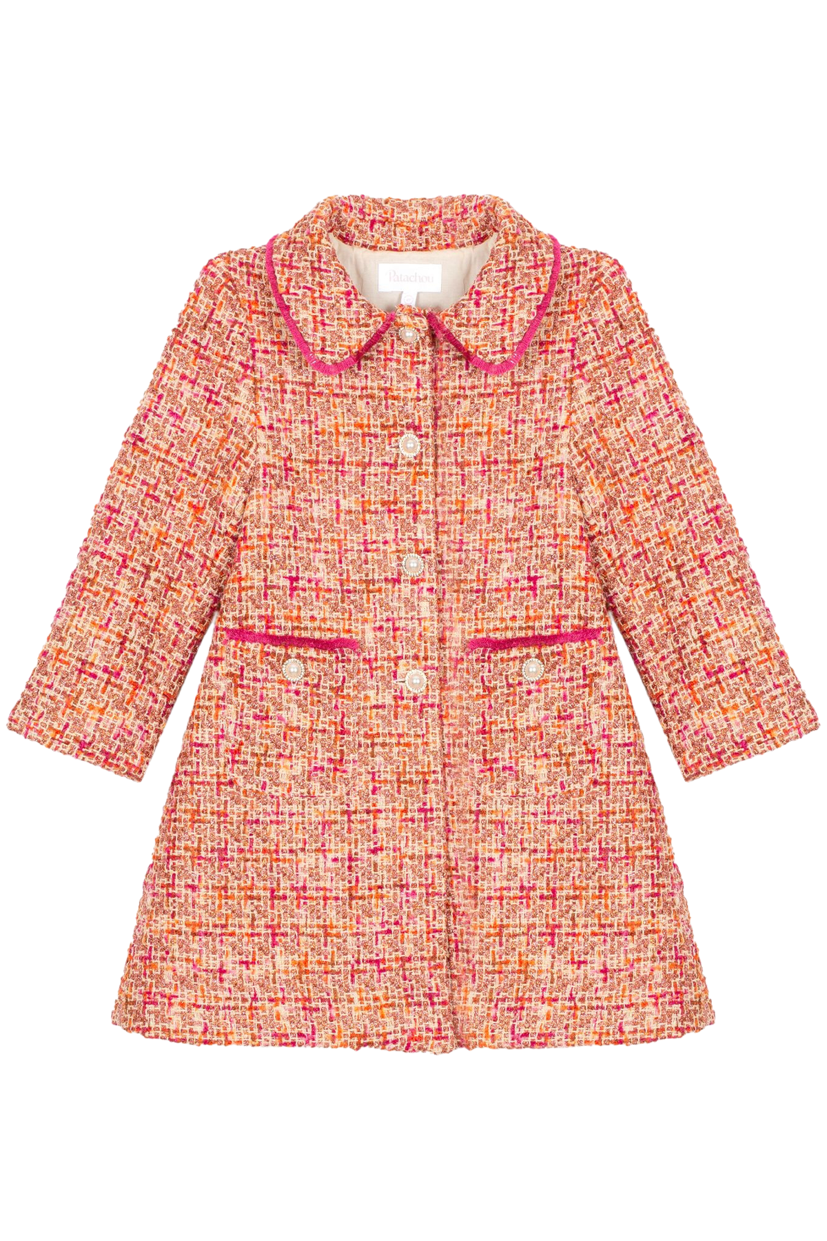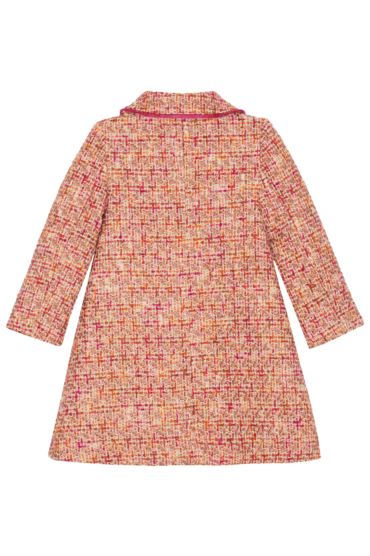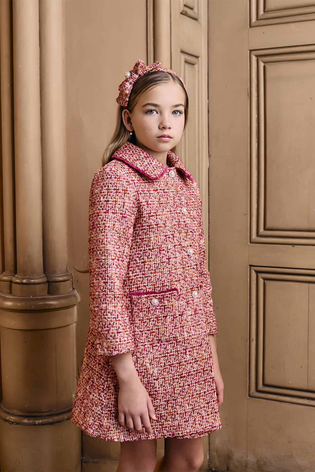 Elegant kappa i fuchsiafärgat tweedtyg, kappan har en krage med dekorativa fransar, framfickor med guldfärgade knappar.