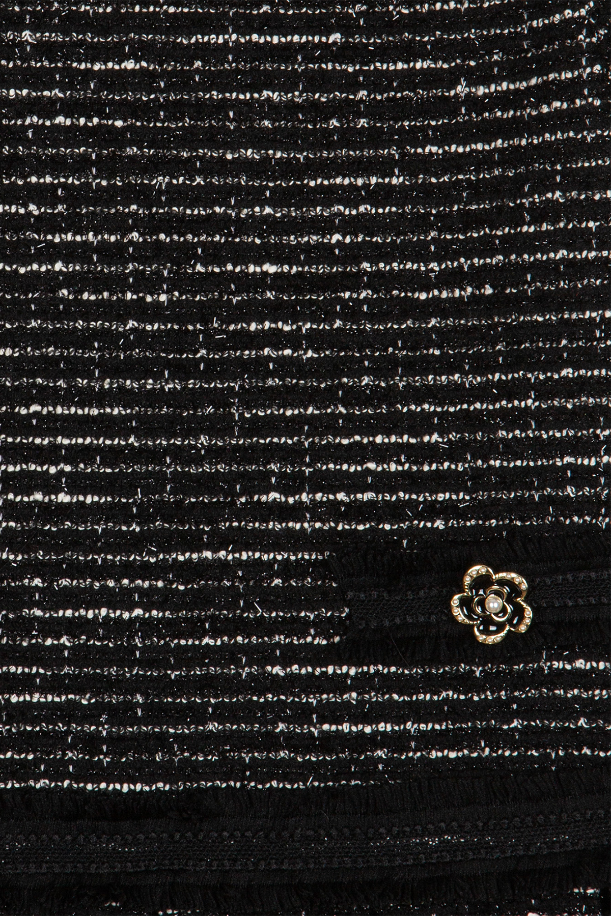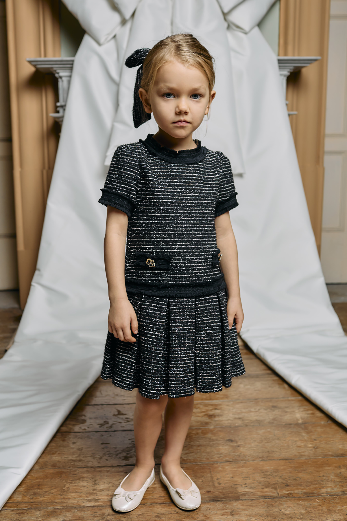 Elegant klänning i en vid passform, klänningen har korta ärmar, lurexdetaljer över hela, dekorativa fickor med blom-formade knappar och en veckad kjol med fransad fåll. Perfekt till säsongens alla firanden!