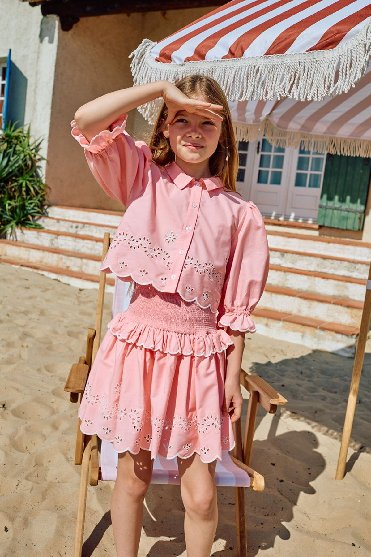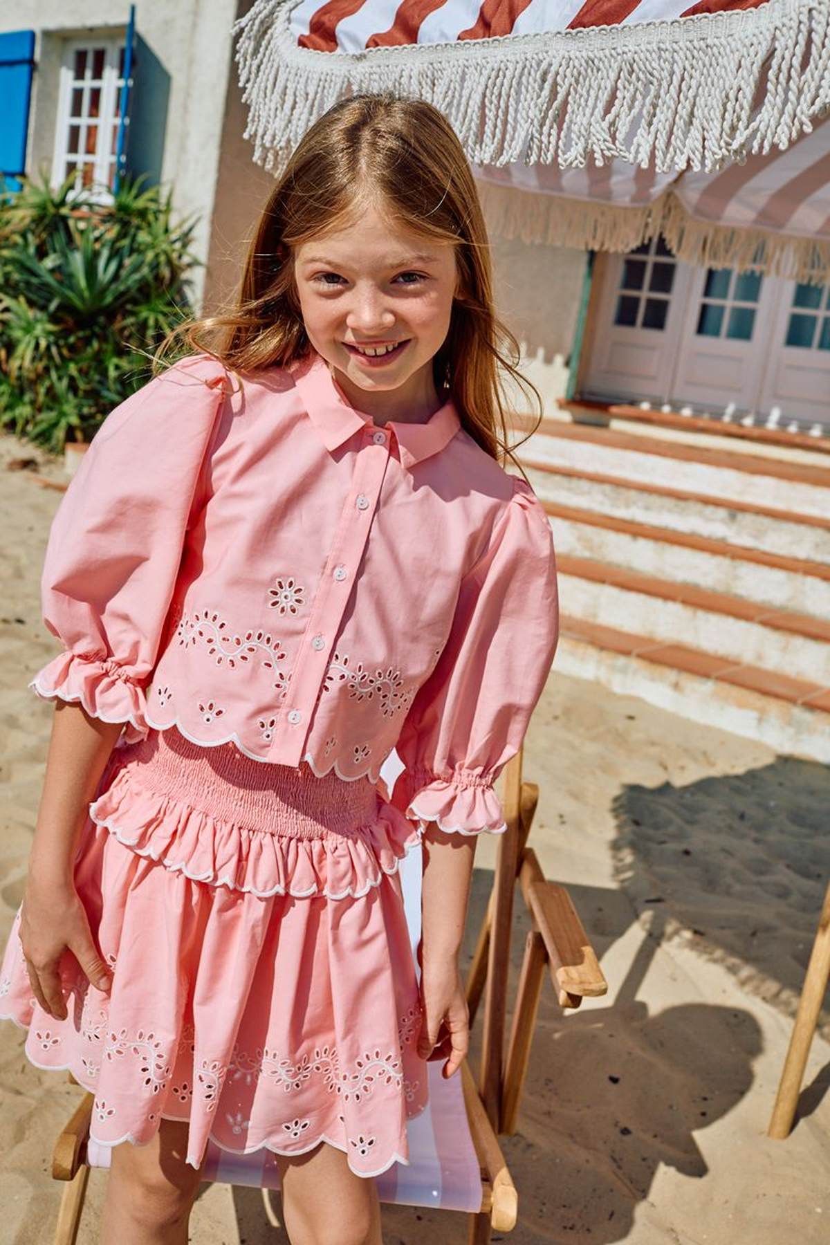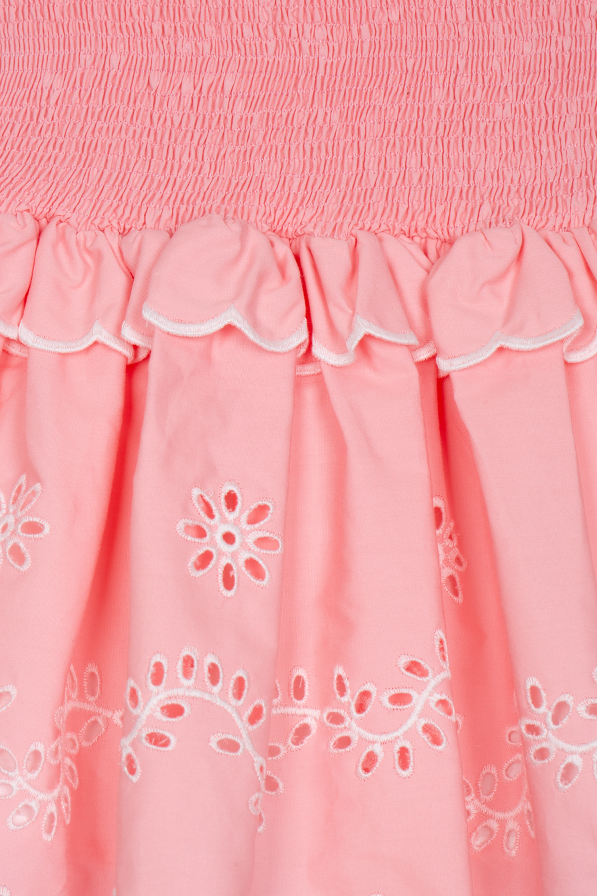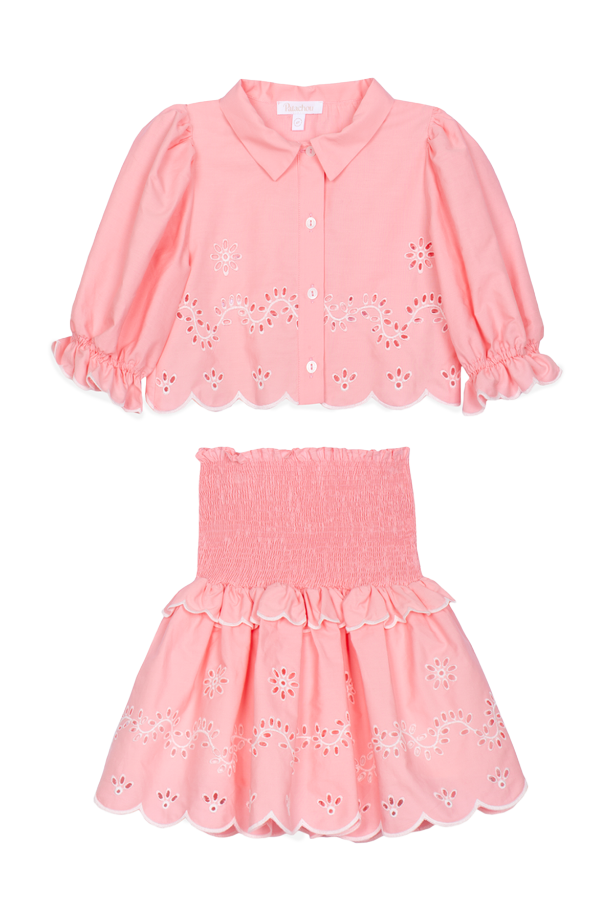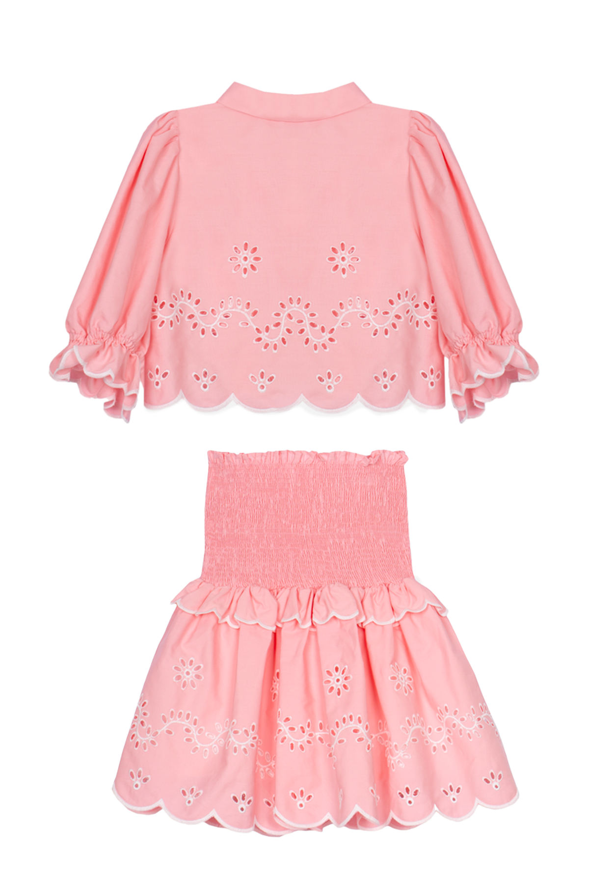 Tvådelat set i elegant design bestående av en smockad kjol och kort blus med trekvartsärm. Ett sofistikerat set med voluminösa silhuetter, prytt av ett tidlöst vackert broderie anglaise-mönster! Den smockade kjolen och det lätta bomullstyget erbjuder både komfort och rörelsefrihet, perfekt för semestern eller sommarkalaset!