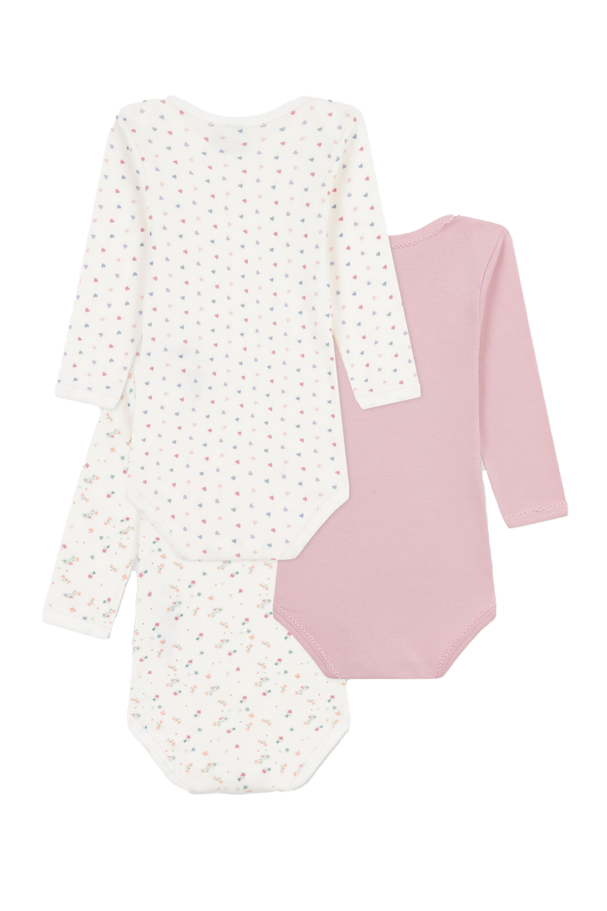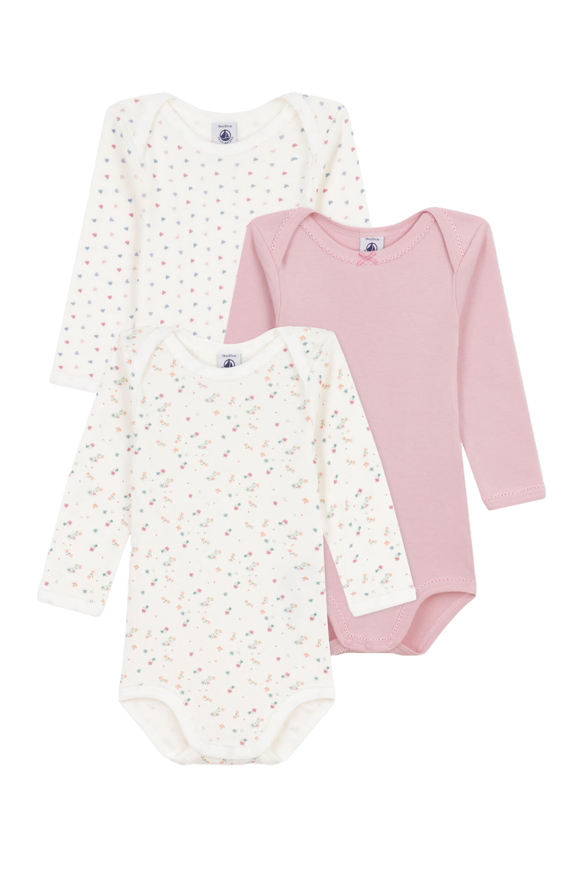 3-pack kortärmade bodys tillverkade i Petit Bateaus ikoniska mjuka ribbstickning av 100% ekologisk bomull. Alla tre med klassisk kuverthals och tryckknappar i grenen för enkel på- och avklädning.