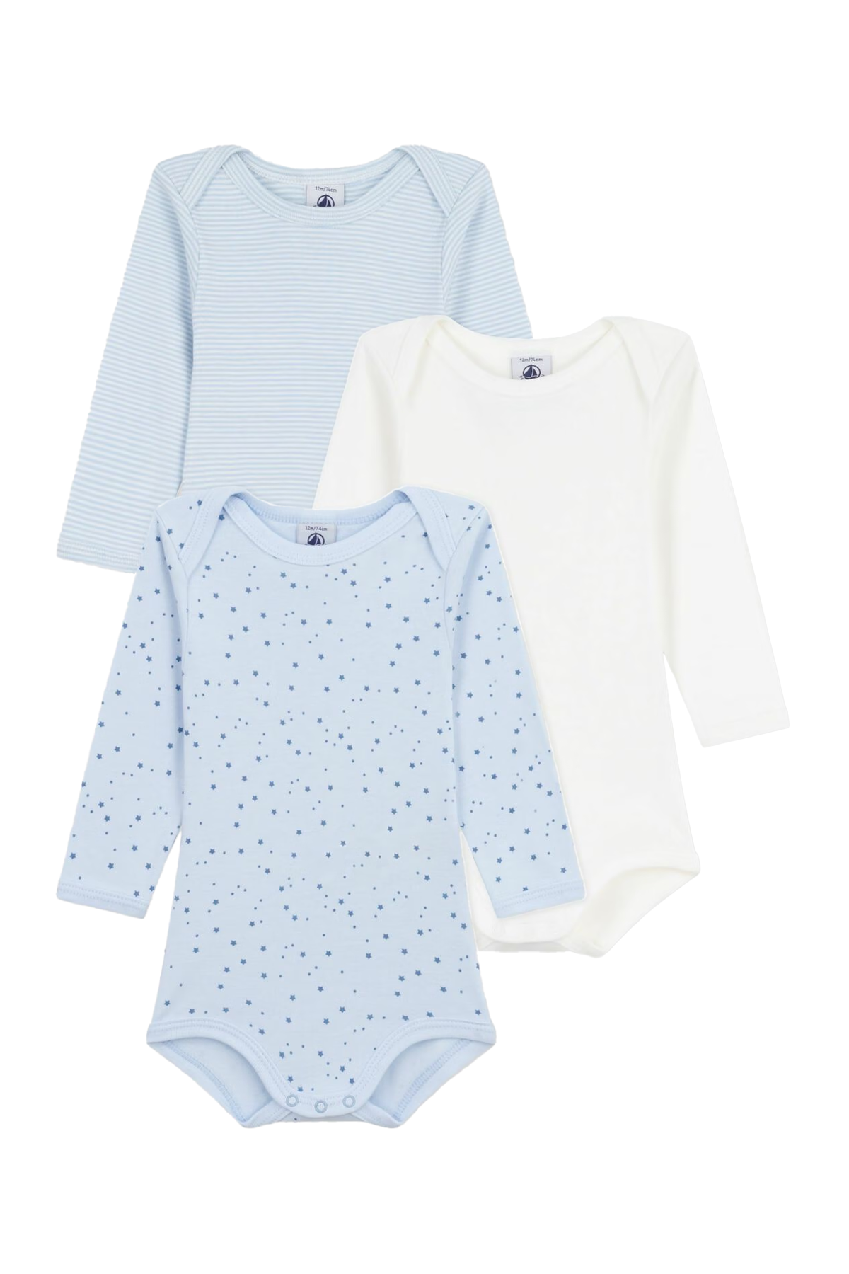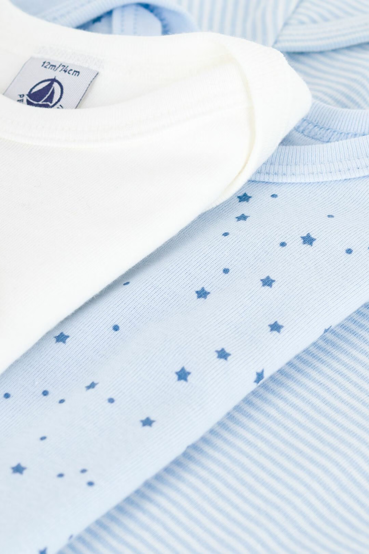 3-pack kortärmade bodys tillverkade i Petit Bateaus ikoniska mjuka ribbstickning av 100% ekologisk bomull. Alla tre med klassisk kuverthals och tryckknappar i grenen för enkel på- och avklädning.