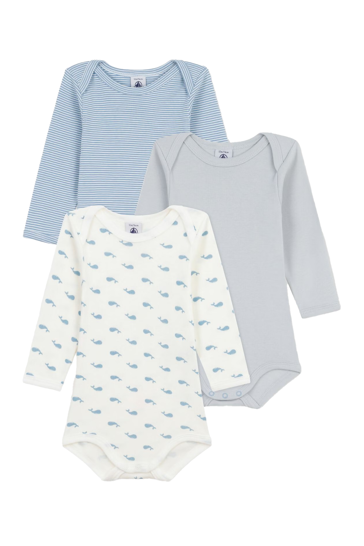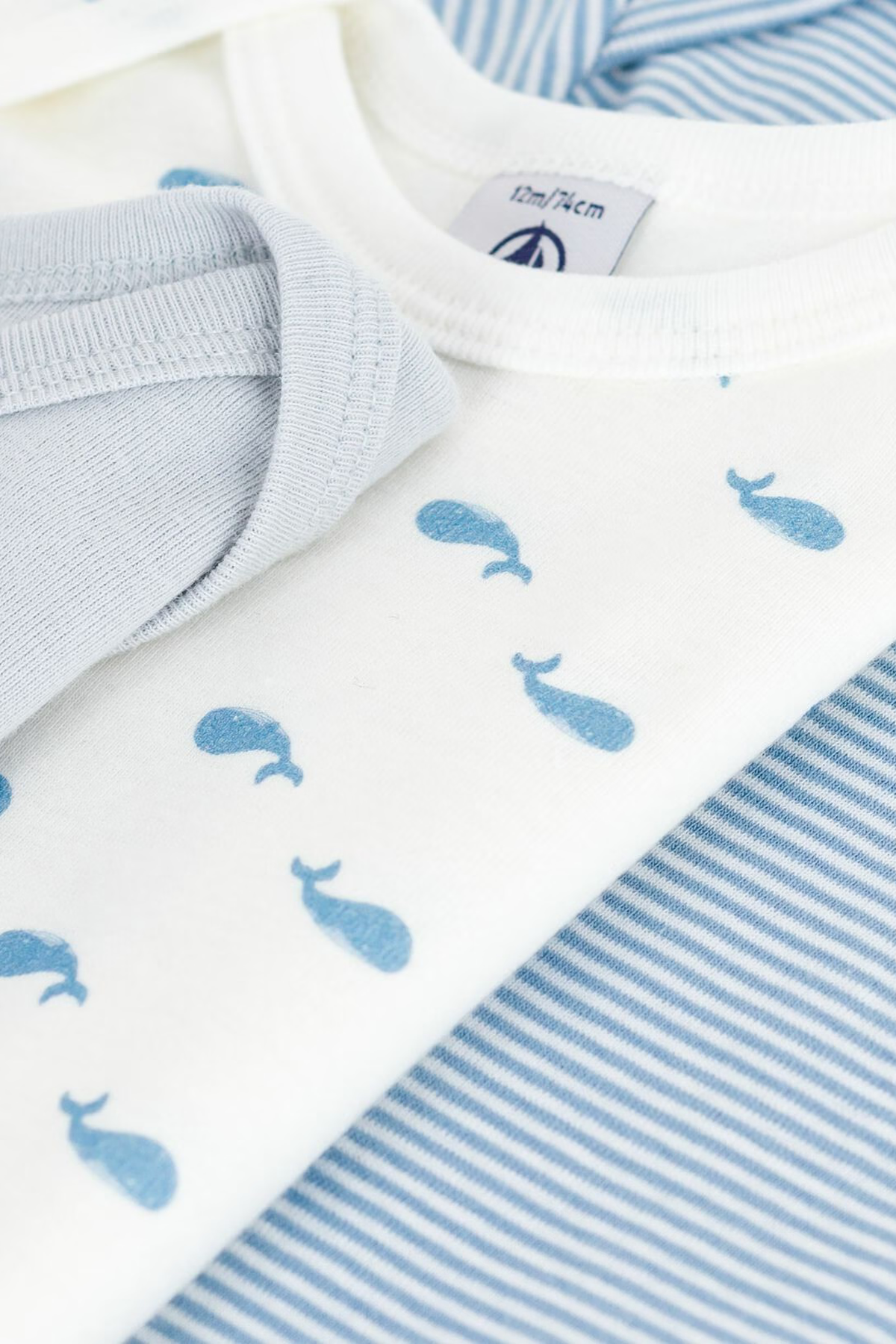 3-pack kortärmade bodys tillverkade i Petit Bateaus ikoniska mjuka ribbstickning av 100% ekologisk bomull. Alla tre med klassisk kuverthals och tryckknappar i grenen för enkel på- och avklädning.