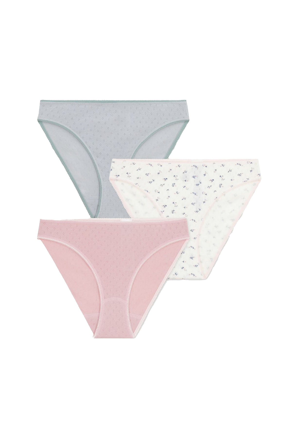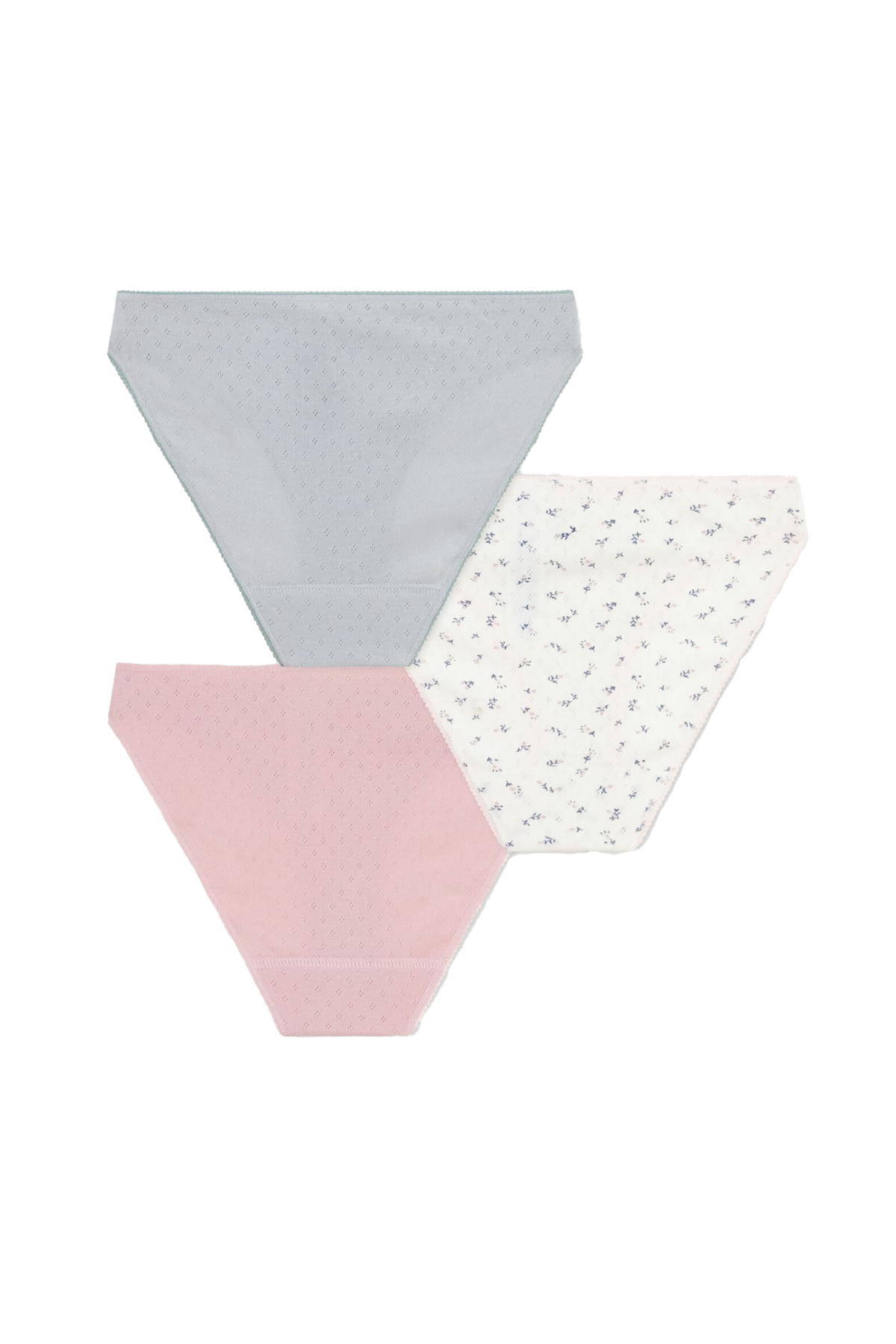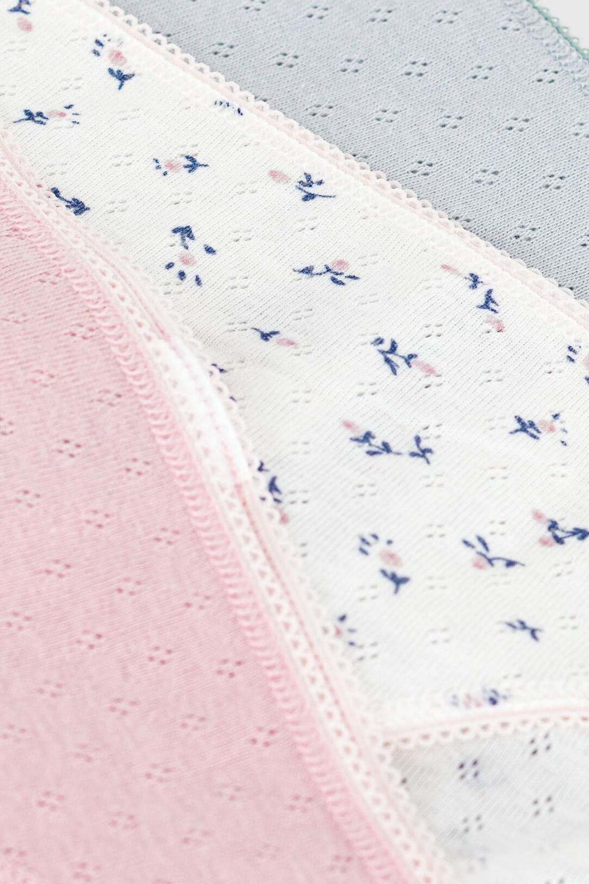 3-pack trosor tillverkade i Petit Bateaus ikoniska och mjuka ribbstickning. Designade i två basfärger och en blommönstrad, alla prydda med söt picotkant.