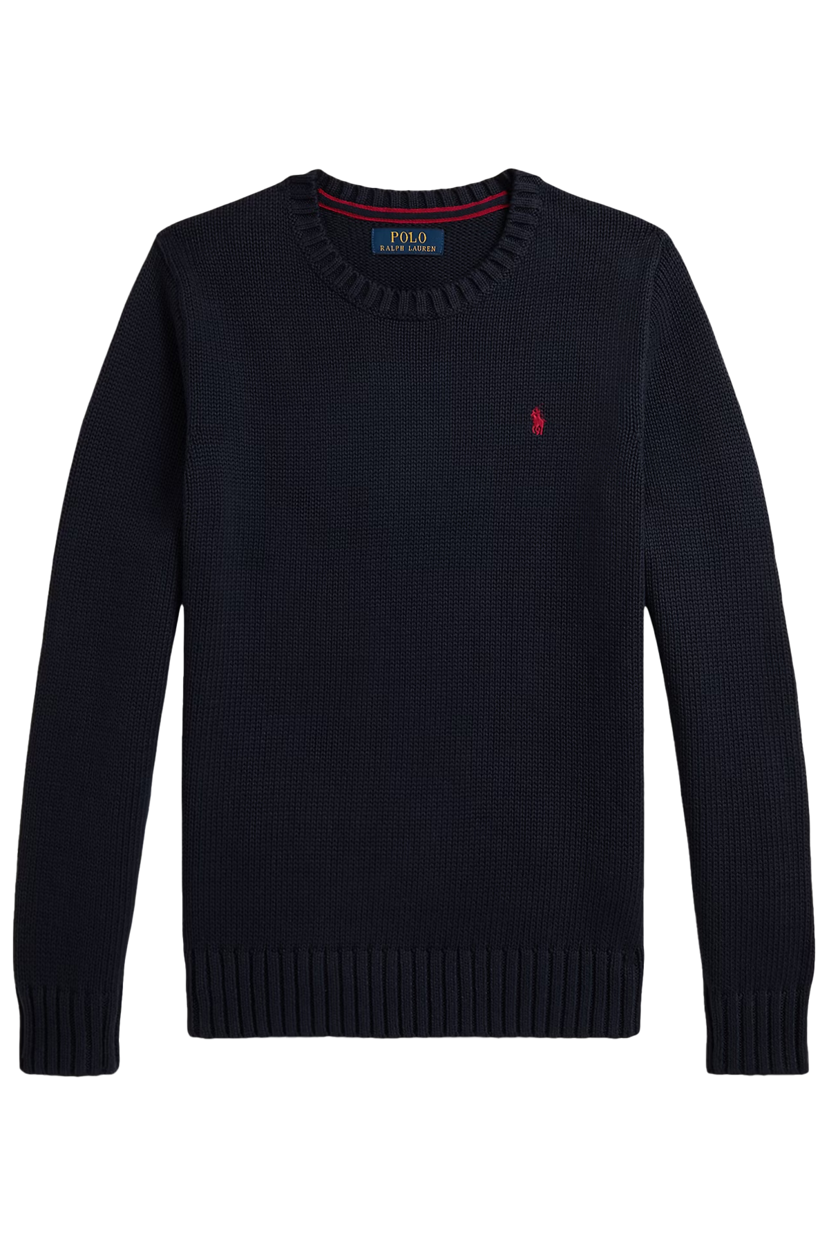 En tidlös klassisker från Ralph Lauren! Denna grovstickade tröja har en normal avslappnad passform, rundhals, ribbade muddar vid kantslut och en liten pony broderad på bröstet.