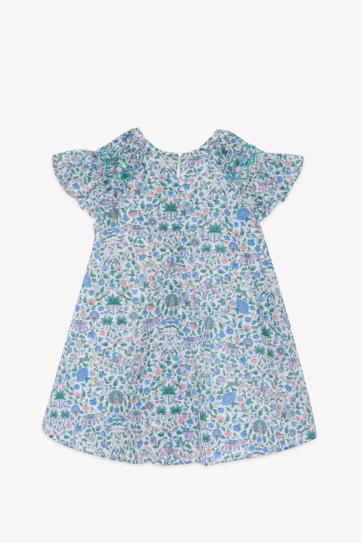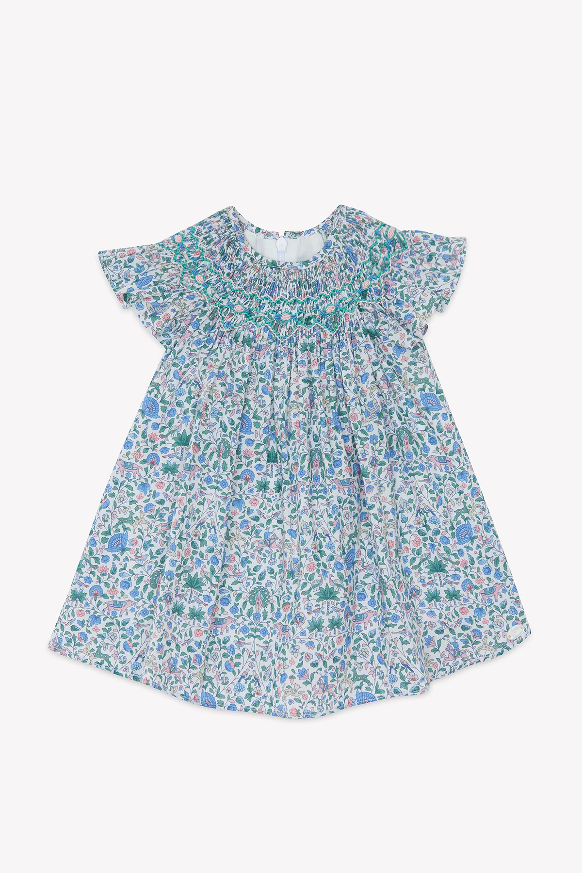 En magisk klänning i blåmönstrat libertytyg! Denna klänning har ett mönster med blommor och djur i blå och rosa färger, en vidare passform, smockad design runt hals och fjärilsärmar.