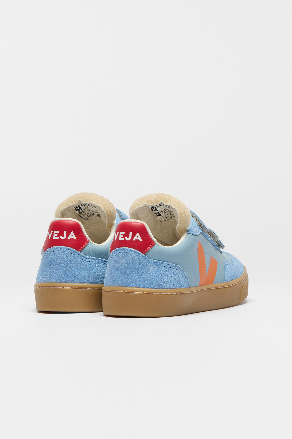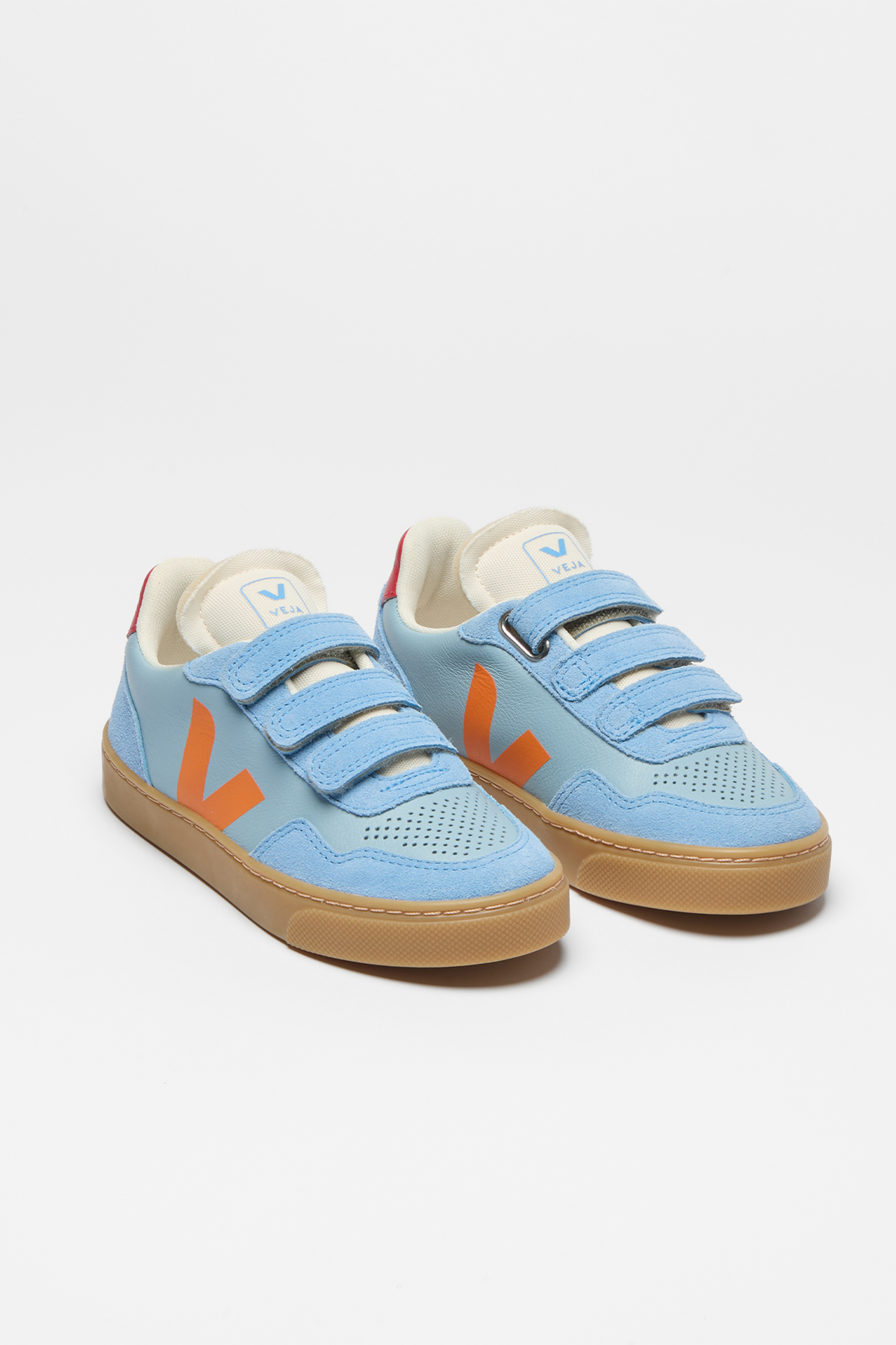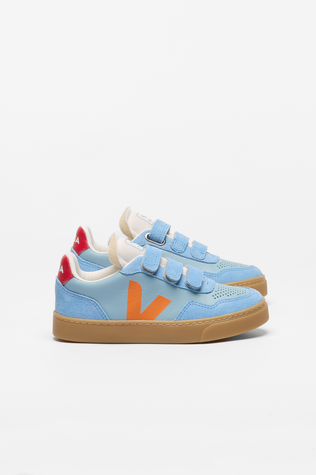 Sportiga sneakers med kardborre, sneakern har en gråvit sula med med kombinationer av veganskt läder och mocka i toner av blått.