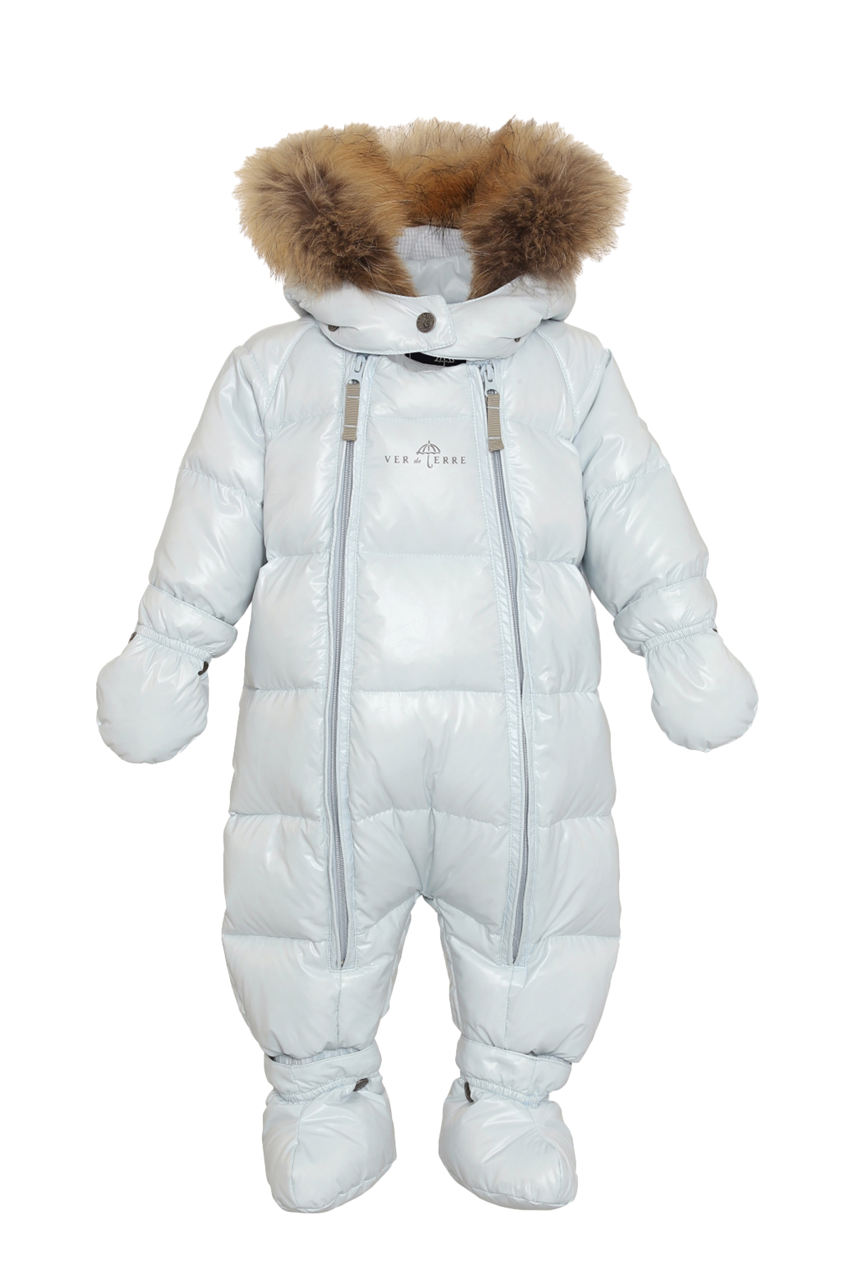 Denna mjuka och praktiska babyoverall från Ver de Terre är ett återkommande nyckelplagg i vintergarderoben med varm dunfyllning och omfamnande pälshuva. Både huvan och pälsen är avtagbara och kan anpassas efter väder och behov. Overallen har dubbla dragkedjor som gör det lätt att ta på och av samt knäppa upp om det blir för varmt.