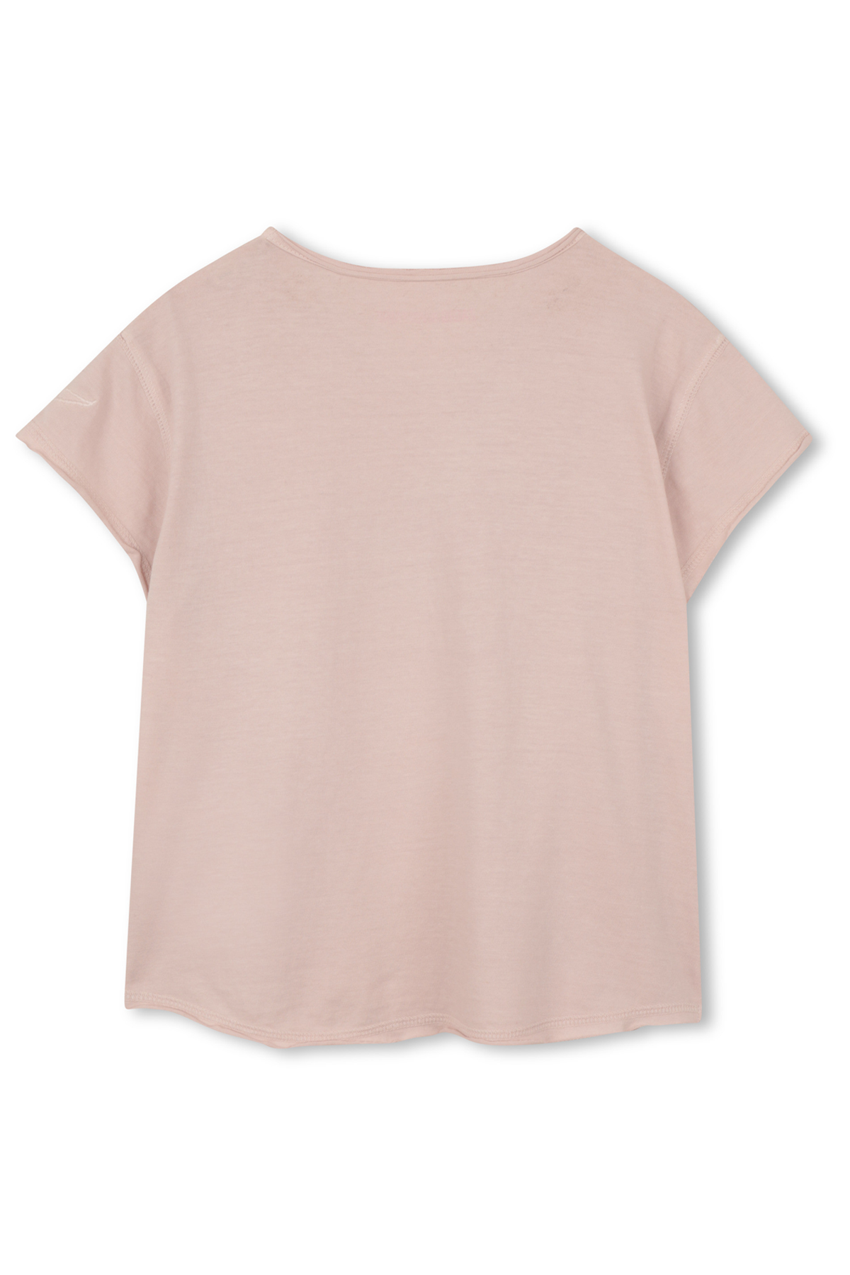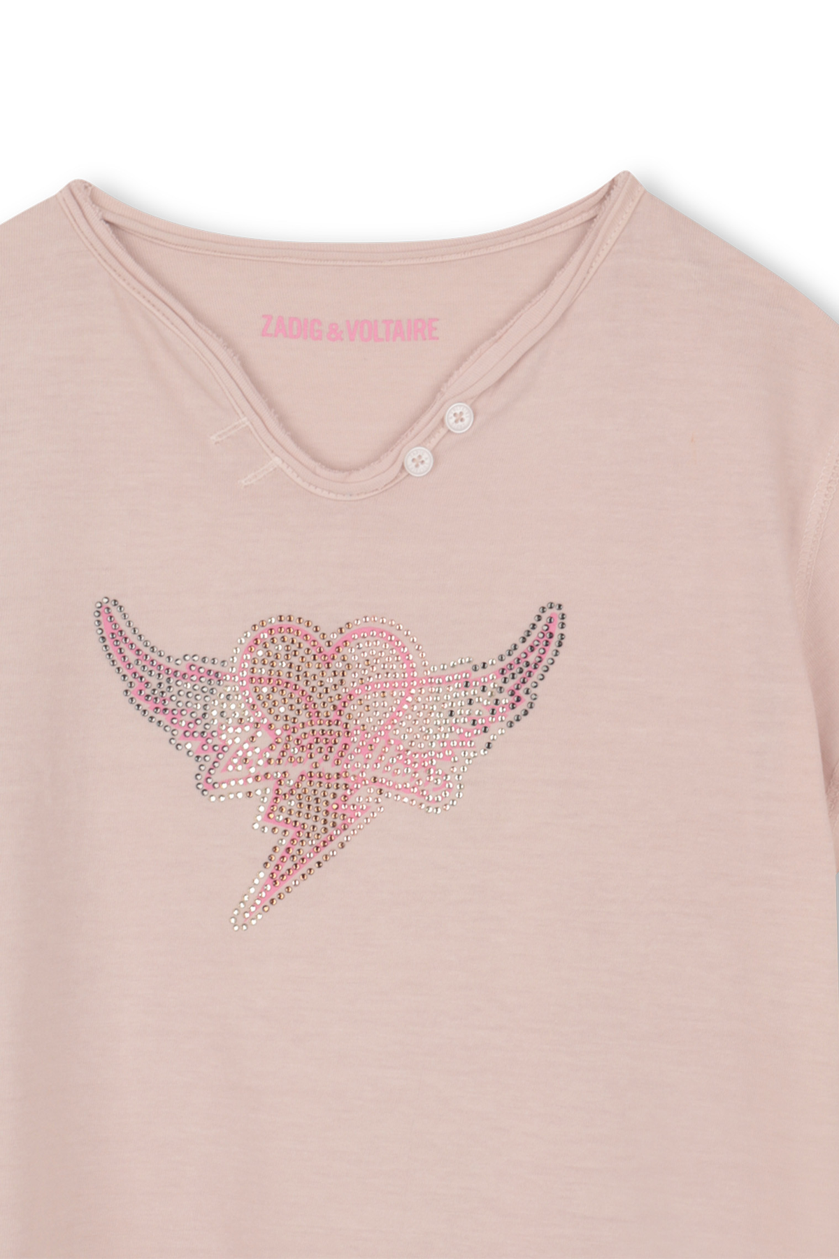 T-shirt Boxo är en återkommande favorit till samlingen som kännetecknas av sin tunisiska krage och variation av tryck och illustrationer i sann Zadig-anda. Denna säsong designad i en mjuk ljusrosa nyans prydd av ett coolt strassbeklätt tryck framtill. Den perfekta basen att kombinera ihop med jeans eller kjol för en rock-chic look!